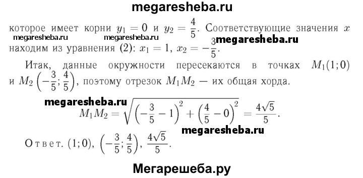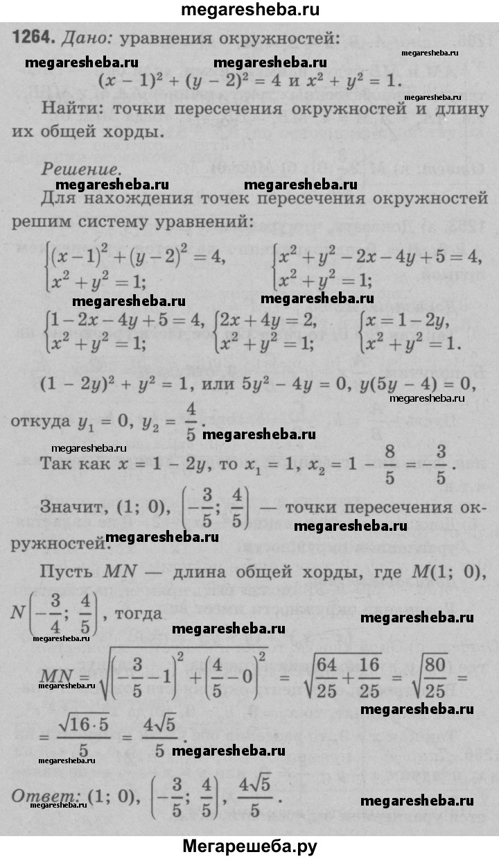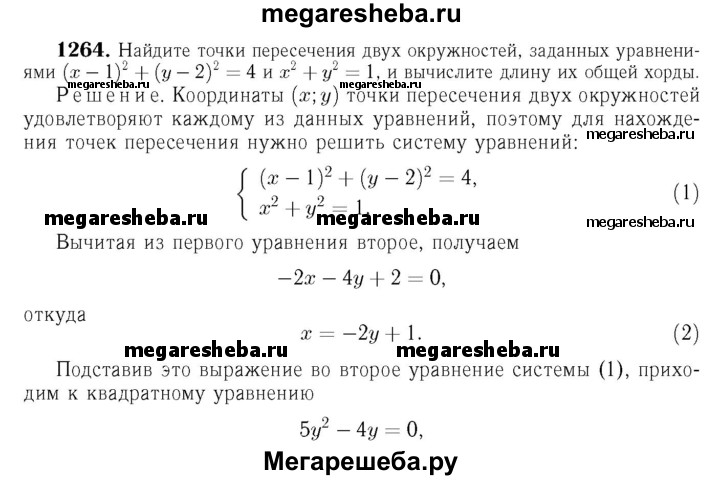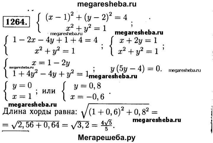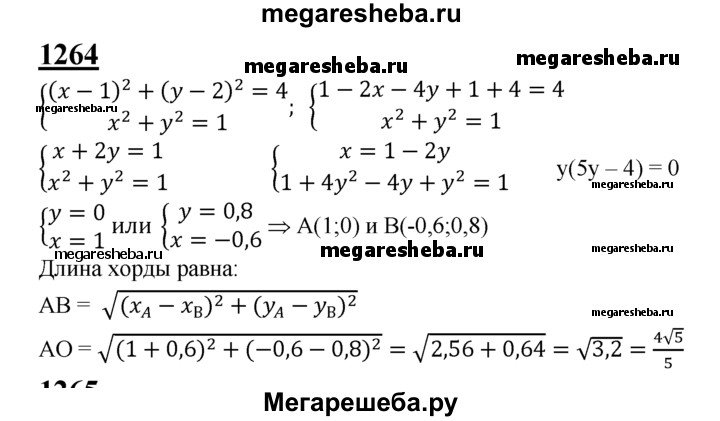 1264 Найдите точки пересечения двух окружностей, заданных уравнениями (х - 1)2 + (у - 2)2 = 4 и х2 + у2= 1, и вычислите длину их общей хорды.