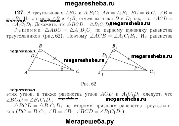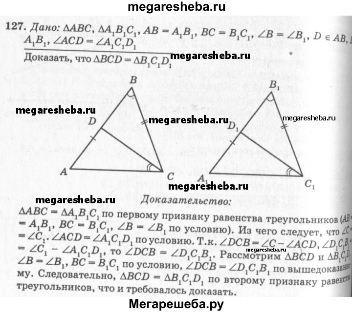 127 В треугольниках ABC и A1B1C1 =, BC = B1C1, ∠B = ∠BX. На сторонах АВ и А1B1 отмечены точки D и D1 так, что ∠ACD = ∠A1C1D1 . Докажите, что ΔBCD = ΔB1C1D1.