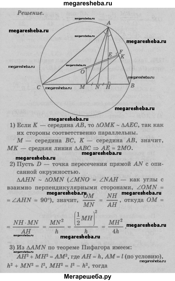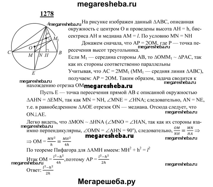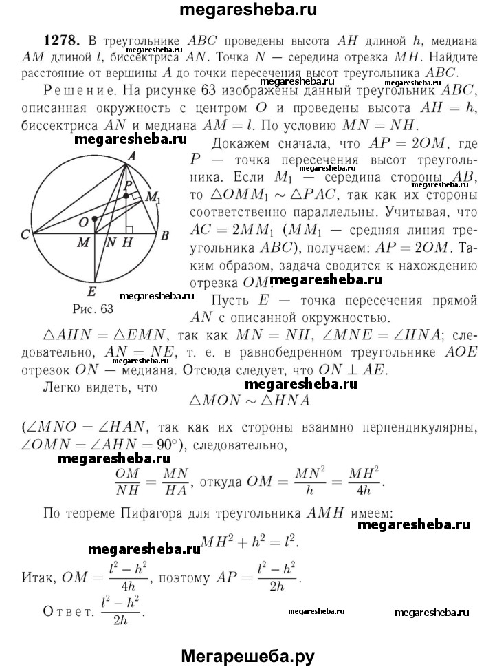 1278 В треугольнике ABC проведены высота АН длиной h, медиана AM длиной I, биссектриса AN. Точка N — середина отрезка МН. Найдите расстояние от вершины А до точки пересечения высот треугольника ABC.