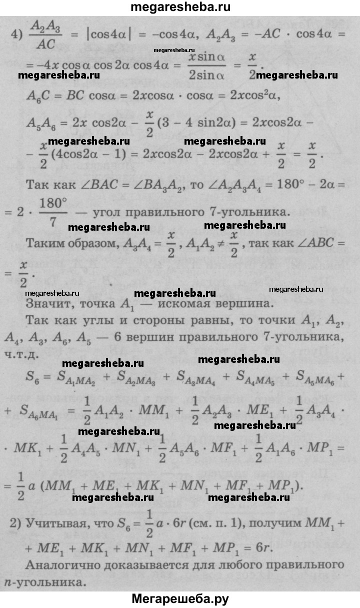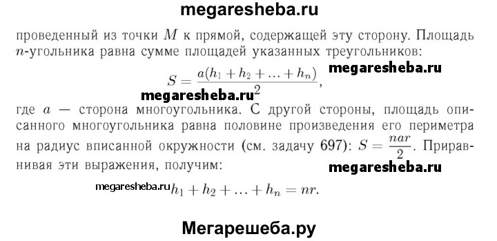 1285 Пусть М — произвольная точка, лежащая внутри правильного n-угольника. Докажите, что сумма перпендикуляров, проведённых из точки М к прямым, содержащим стороны n-угольника, равна nr, где г — радиус вписанной окружности.