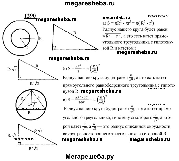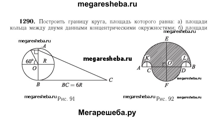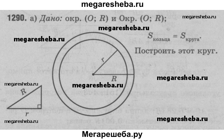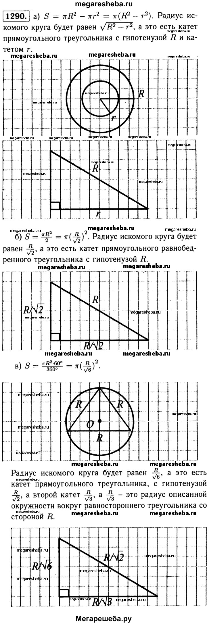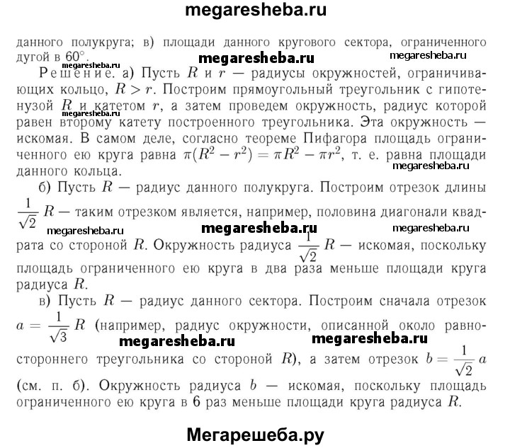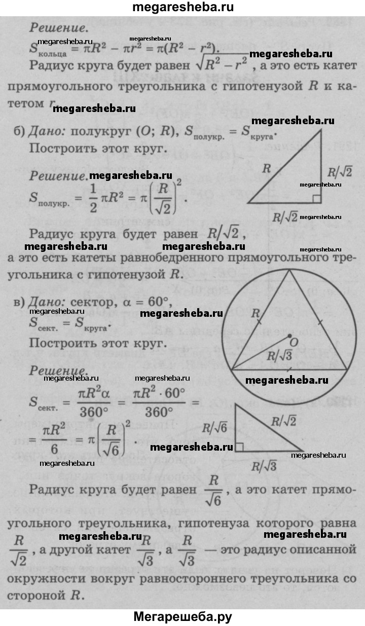 1290 Постройте границу круга, площадь которого равна: а) площади кольца между двумя данными концентрическими окружностями; б) площади данного полукруга; в) площади данного кругового сектора, ограниченного дугой в 60°.