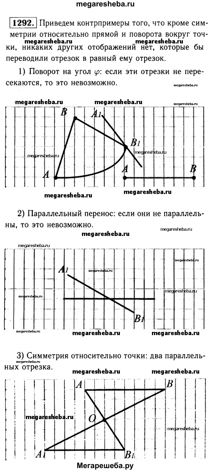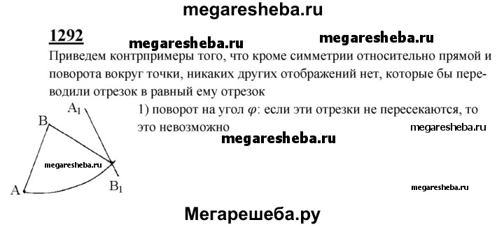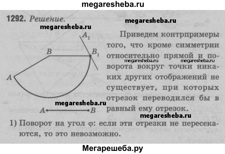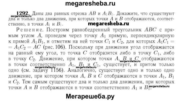 1292 Даны два равных отрезка АВ и А1В1. Докажите, что существуют два и только два движения, при которых точки А и В отображаются соответственно в точки A1 и В1.