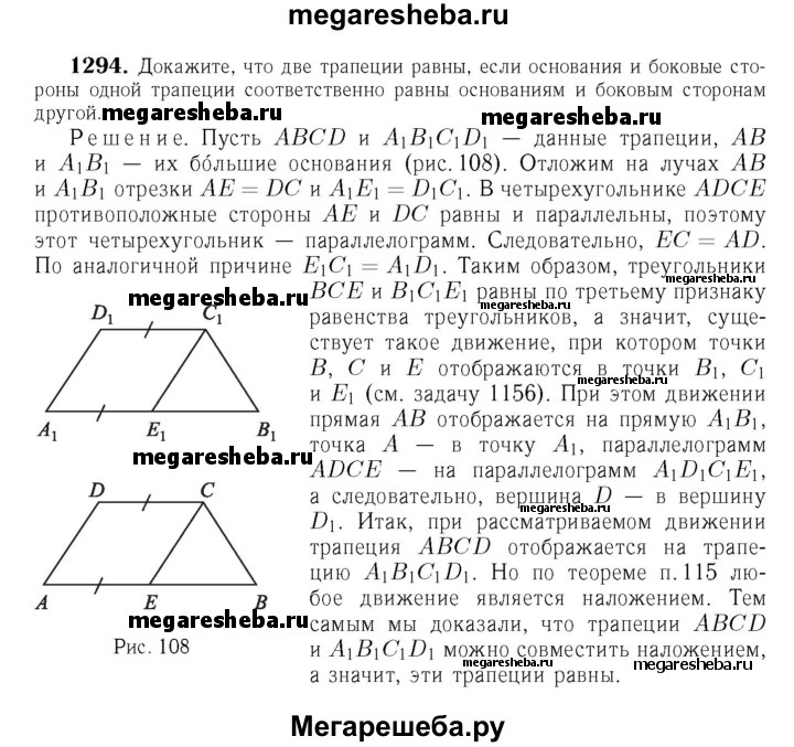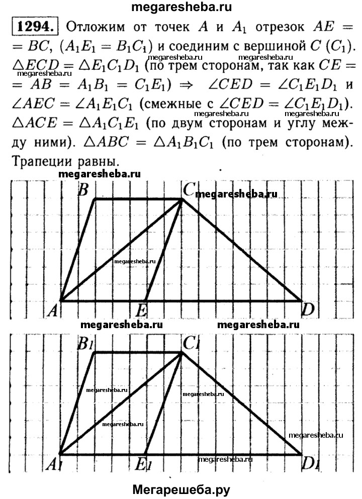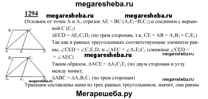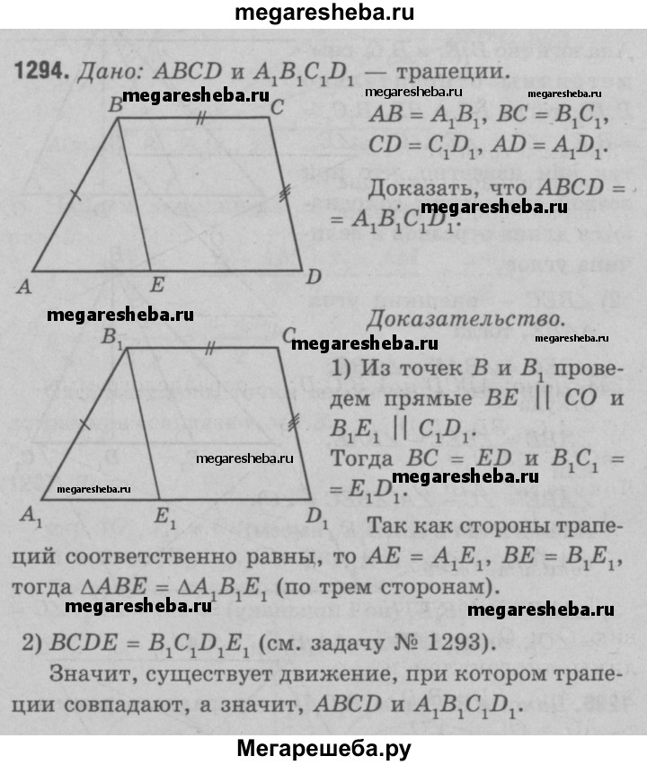 1294 Докажите, что две трапеции равны, если основания и боковые стороны одной трапеции соответственно равны основаниям и боковым сторонам другой.