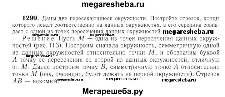 1299 Даны две пересекающиеся окружности. Постройте отрезок, концы которого лежат соответственно на данных окружностях, а его середина совпадает с одной из точек пересечения данных окружностей
