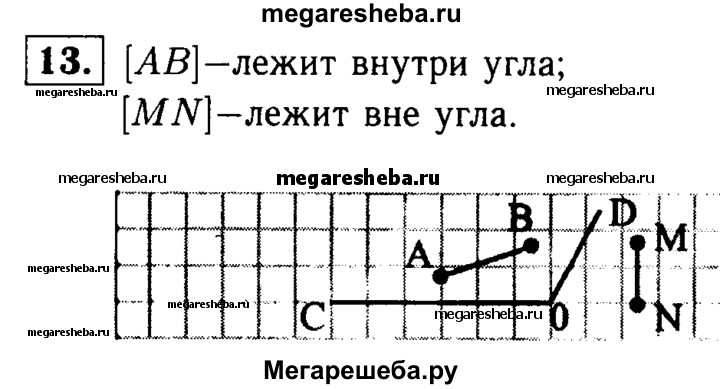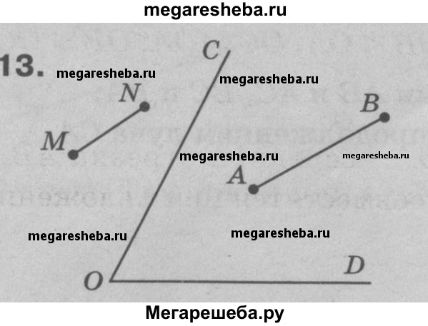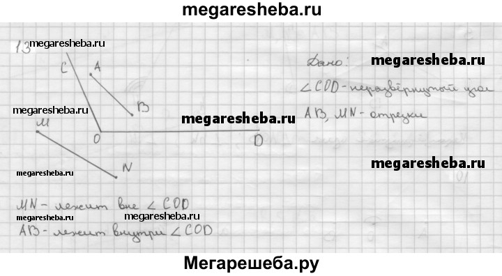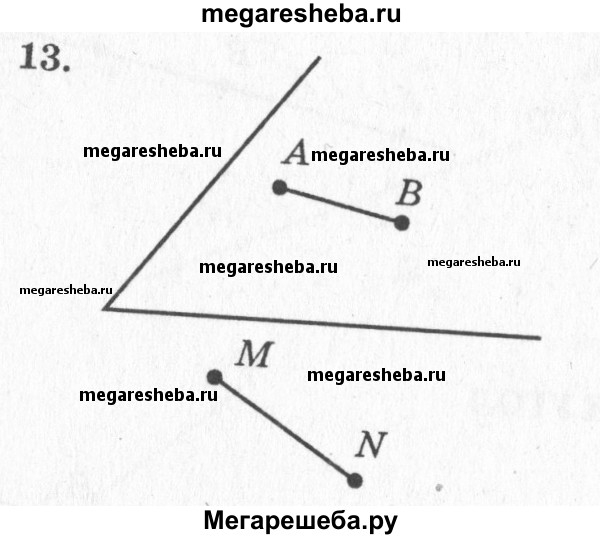 13 Начертите неразвёрнутый угол. Отметьте точки А, В, М и N так, чтобы все точки отрезка АВ лежали внутри угла, а все точки отрезка MN лежали вне угла.