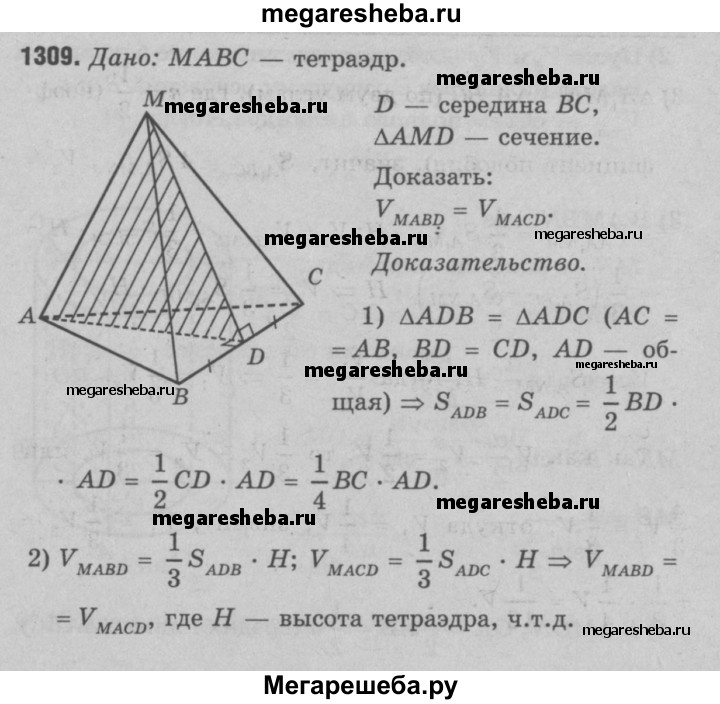 1309 Докажите, что плоскость, проходящая через ребро и середину противоположного ребра тетраэдра, разделяет его на две части, объёмы которых равны.
