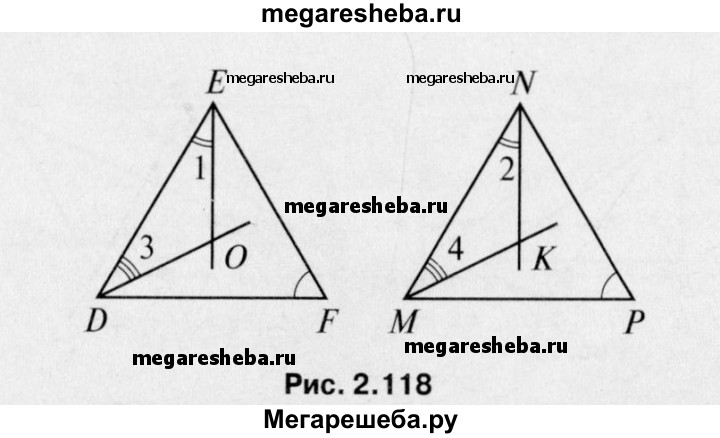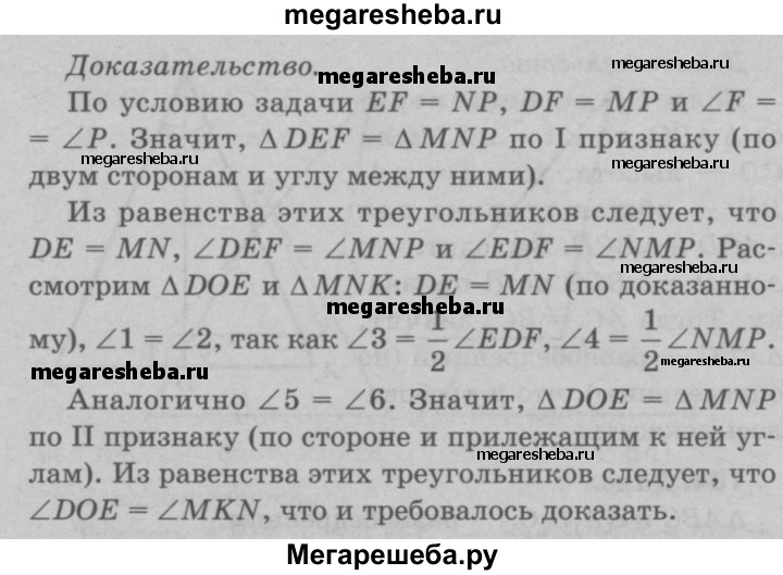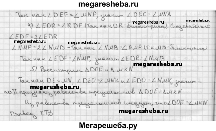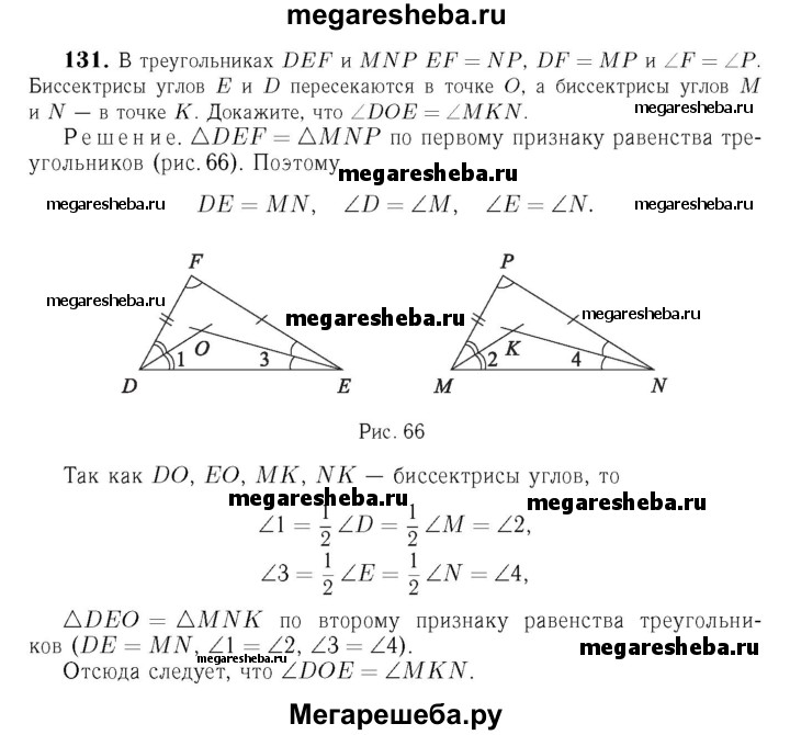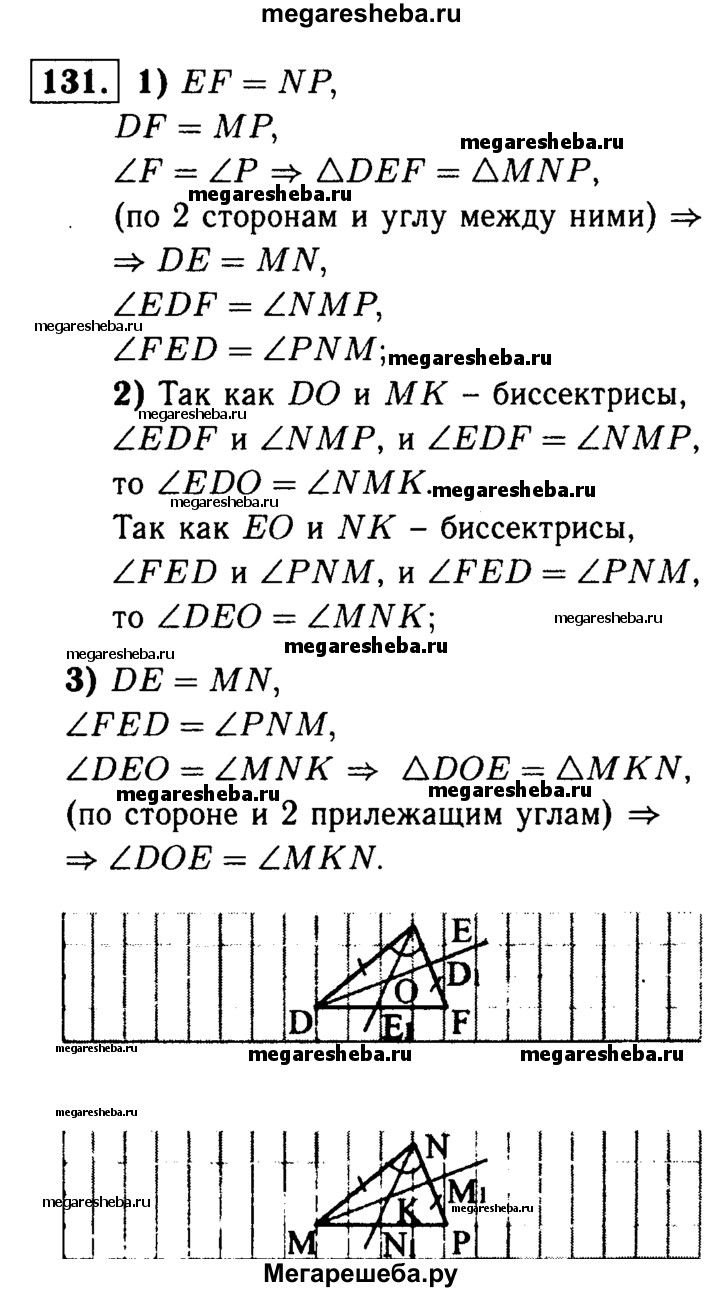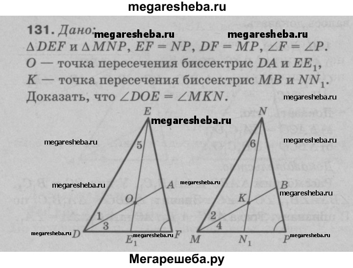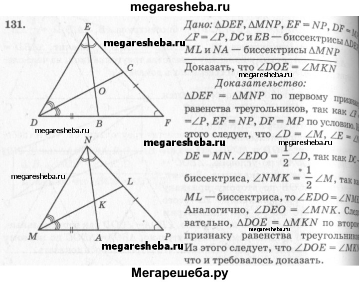131 В треугольниках DEF и MNP EF = NP, DF = MP и ∠F = ∠P. Биссектрисы углов Е и D пересекаются в точке О, а биссектрисы углов М и N — в точке К. Докажите, что ∠DOE = ∠MKN.