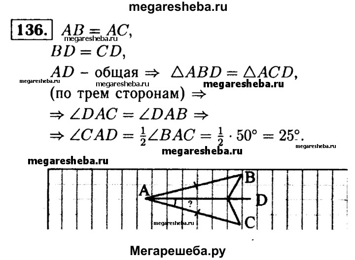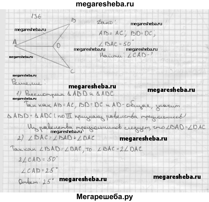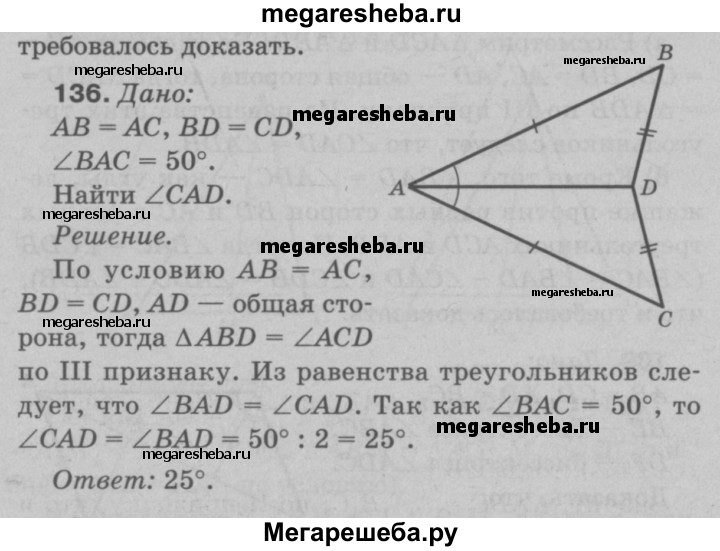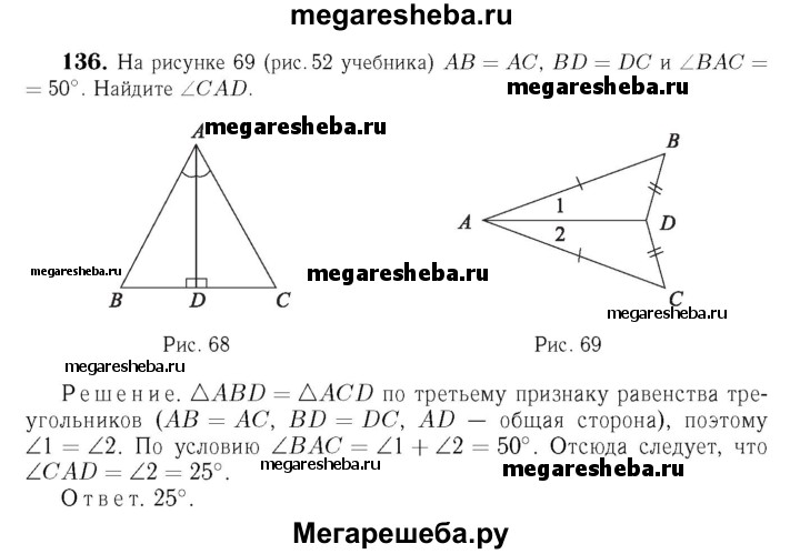 136 На рисунке 52 (см. с. 31) АВ = АС, BD = DC и ∠BAC = 50°. Найдите ∠CAD.