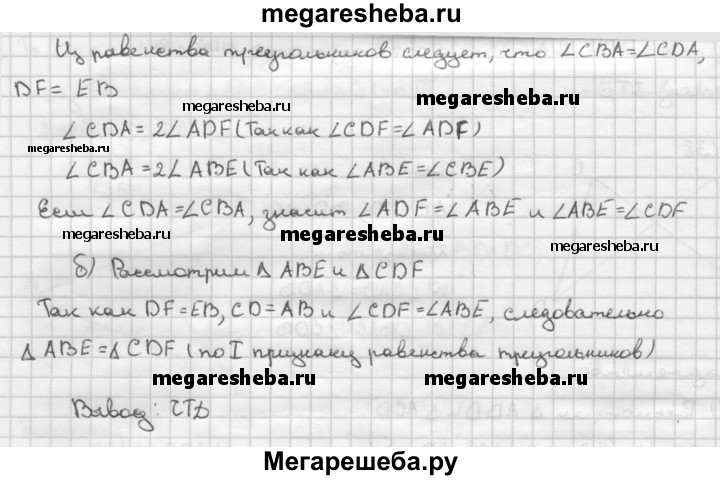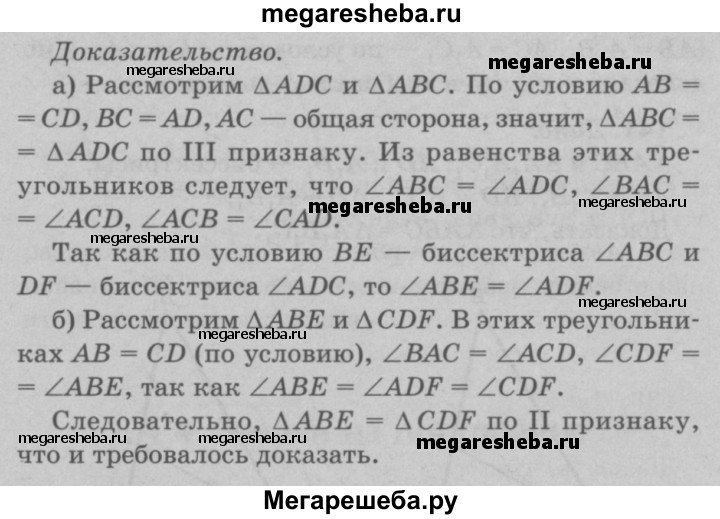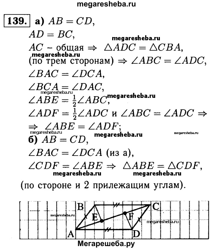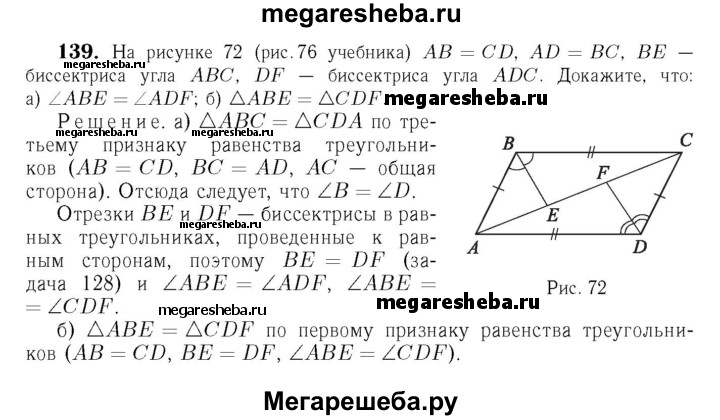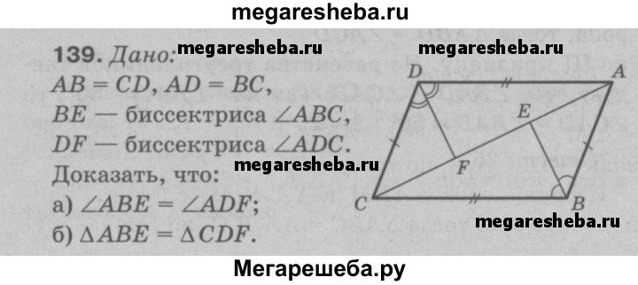 139 На рисунке 76 AB = CD, AD = BC, BE — биссектриса угла ABC, a DF — биссектриса угла ADC. Докажите, что: а) ∠ABE = ∠ADF; б) ΔАВЕ = ΔCDF.
