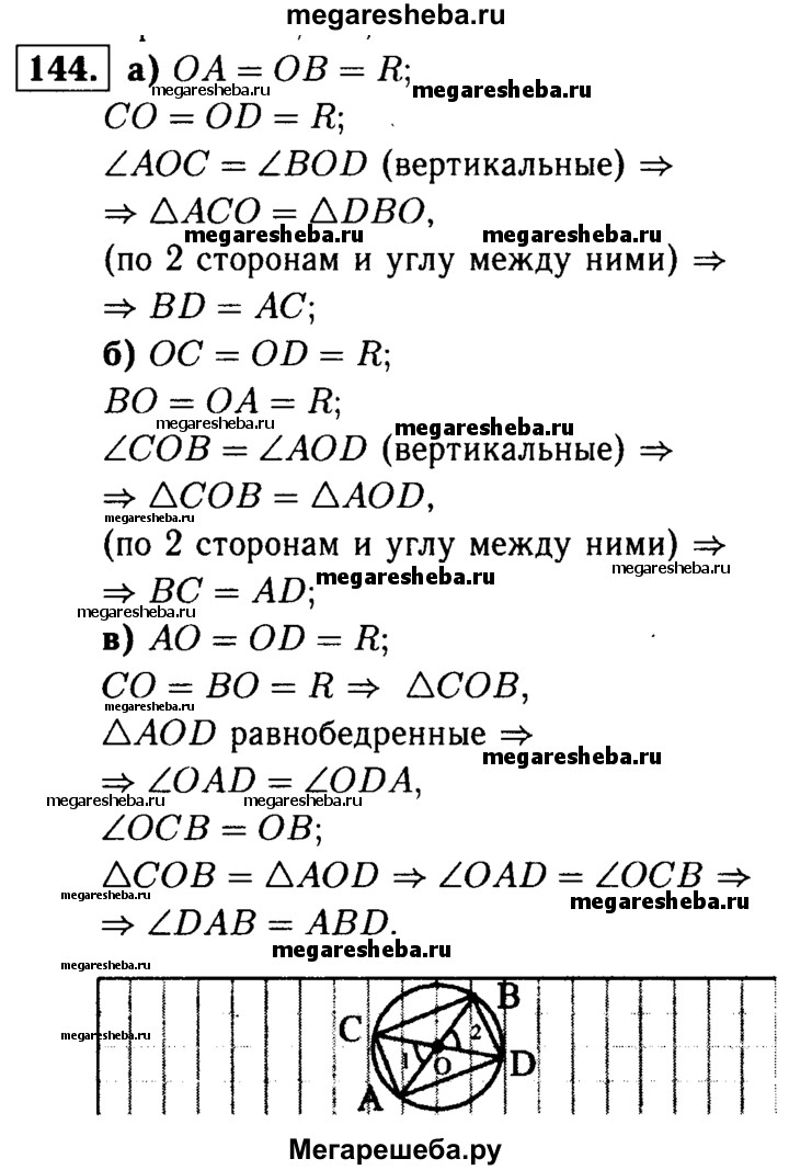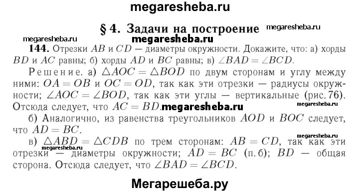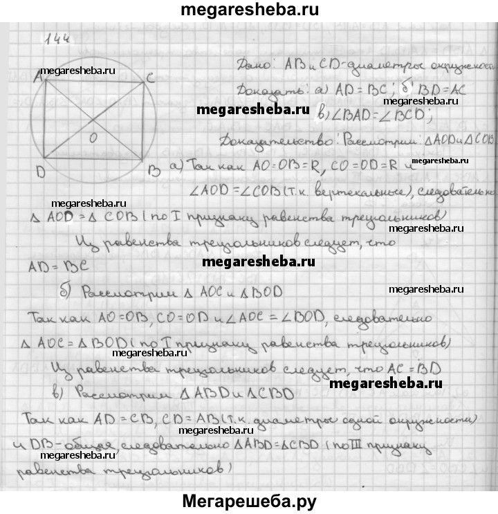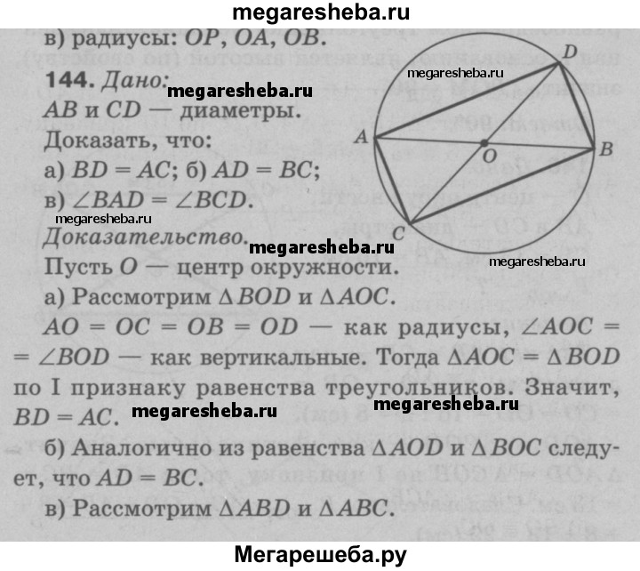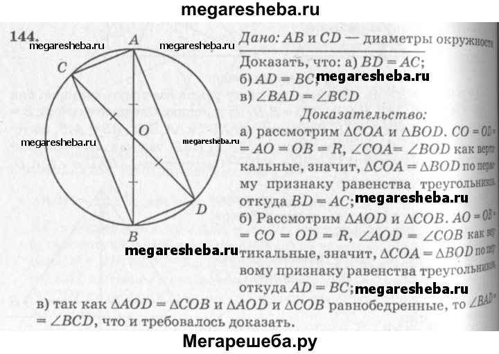 144 Отрезки АВ и CD — диаметры окружности. Докажите, что: а) хорды BD и АС равны; б) хорды AD и ВС равны; в) ∠BAD = ∠BCD.
