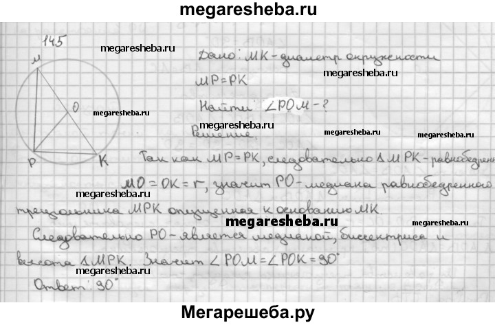 145 Отрезок МК — диаметр окружности с центром О, a MP и РК — равные хорды этой окружности. Найдите ∠POM.