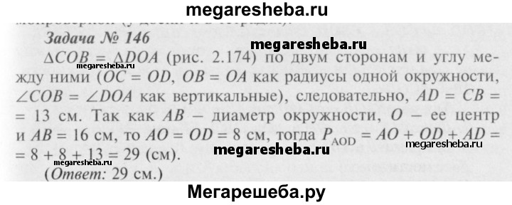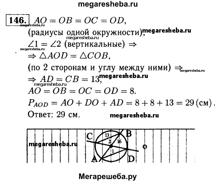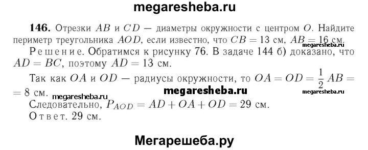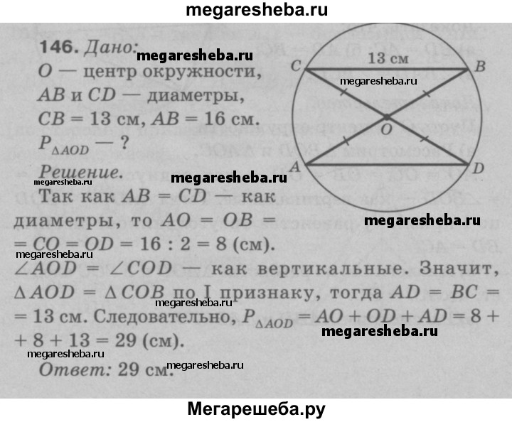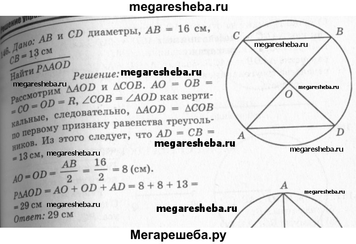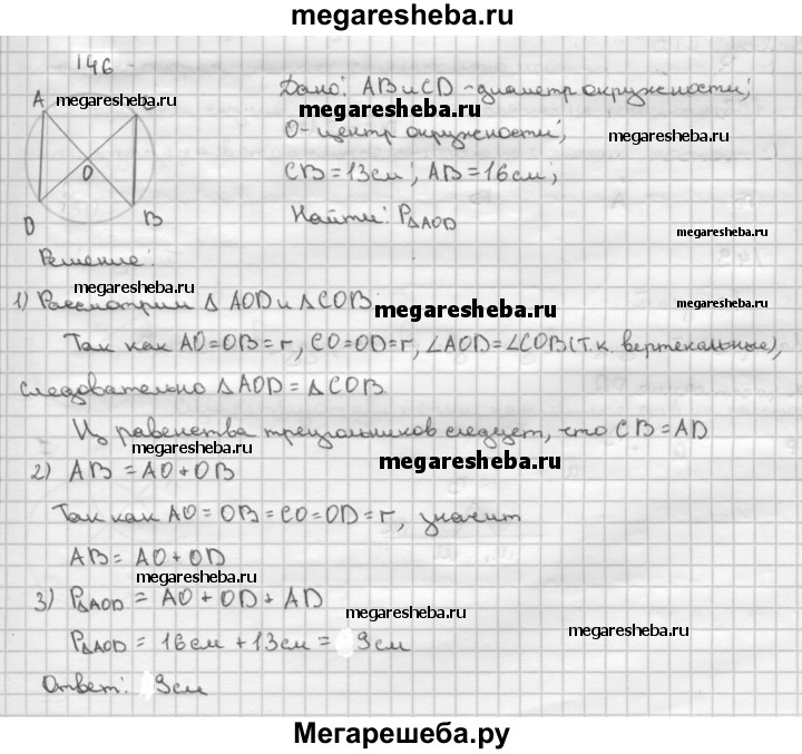 146 Отрезки АВ и CD — диаметры окружности с центром О. Найдите периметр треугольника AOD, если известно, что СB = 13 см, АВ = 16 см.