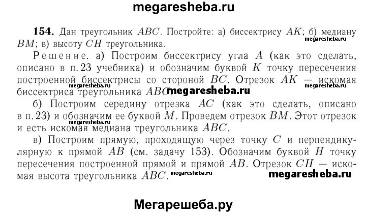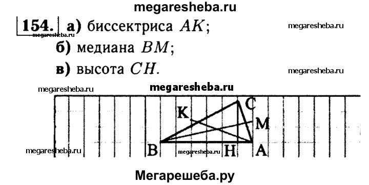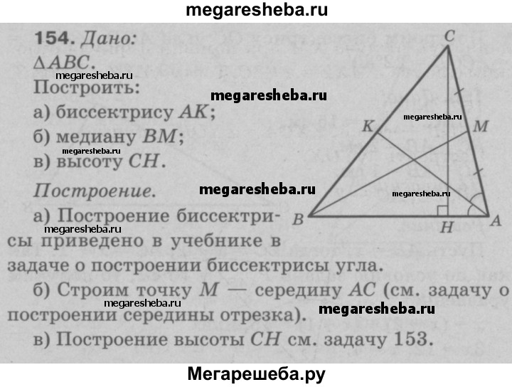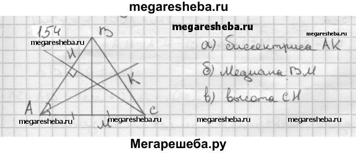 154 Дан треугольник ABC. Постройте: а) биссектрису АК; б) медиану ВМ; в) высоту СН треугольника.