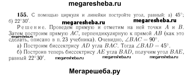 155 С помощью циркуля и линейки постройте угол, равный: а) 45°; б) 22°30'.