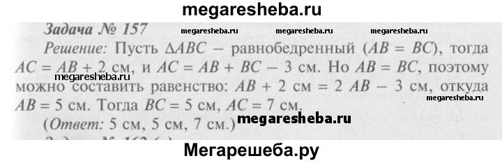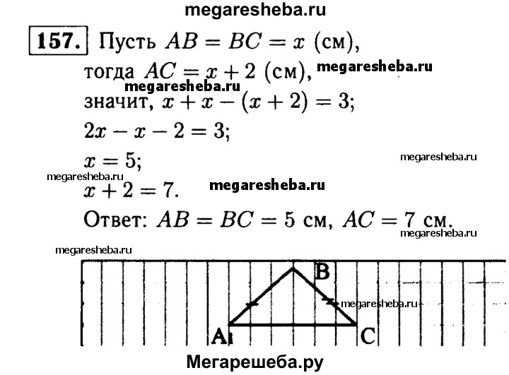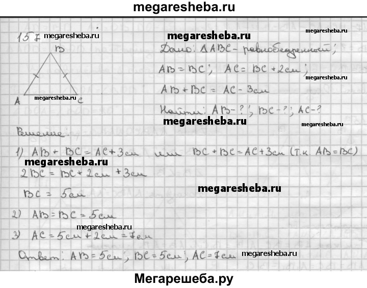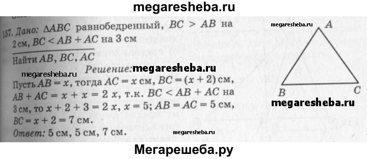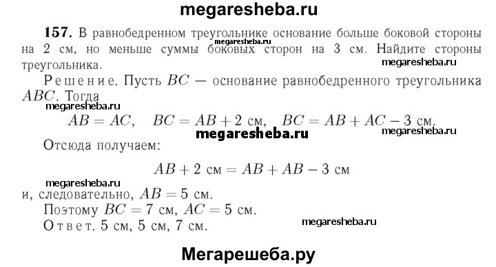 157 В равнобедренном треугольнике основание больше боковой стороны на 2 см, но меньше суммы боковых сторон на 3 см. Найдите стороны треугольника.