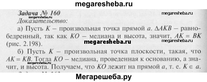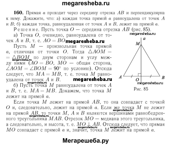 160 Прямая а проходит через середину отрезка АВ и перпендикулярна к нему. Докажите, что: а) каждая точка прямой а равноудалена от точек А и В; б) каждая точка, равноудалённая от точек А и В, лежит на прямой а.