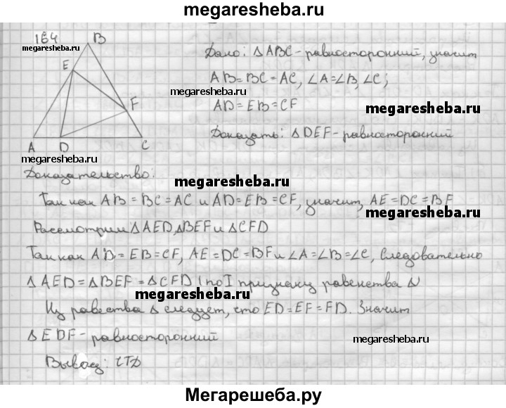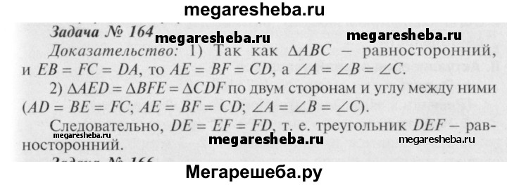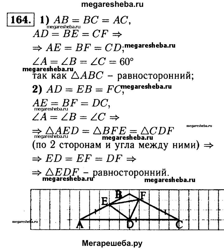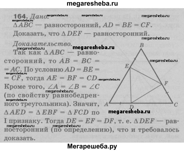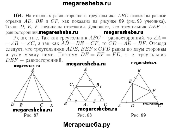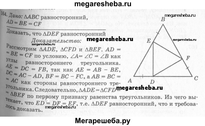 164 На сторонах равностороннего треугольника ABC отложены равные отрезки AD, BE и CF, как показано на рисунке 93. Точки D, Е, F соединены отрезками. Докажите, что треугольник DEF — равносторонний.