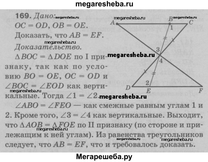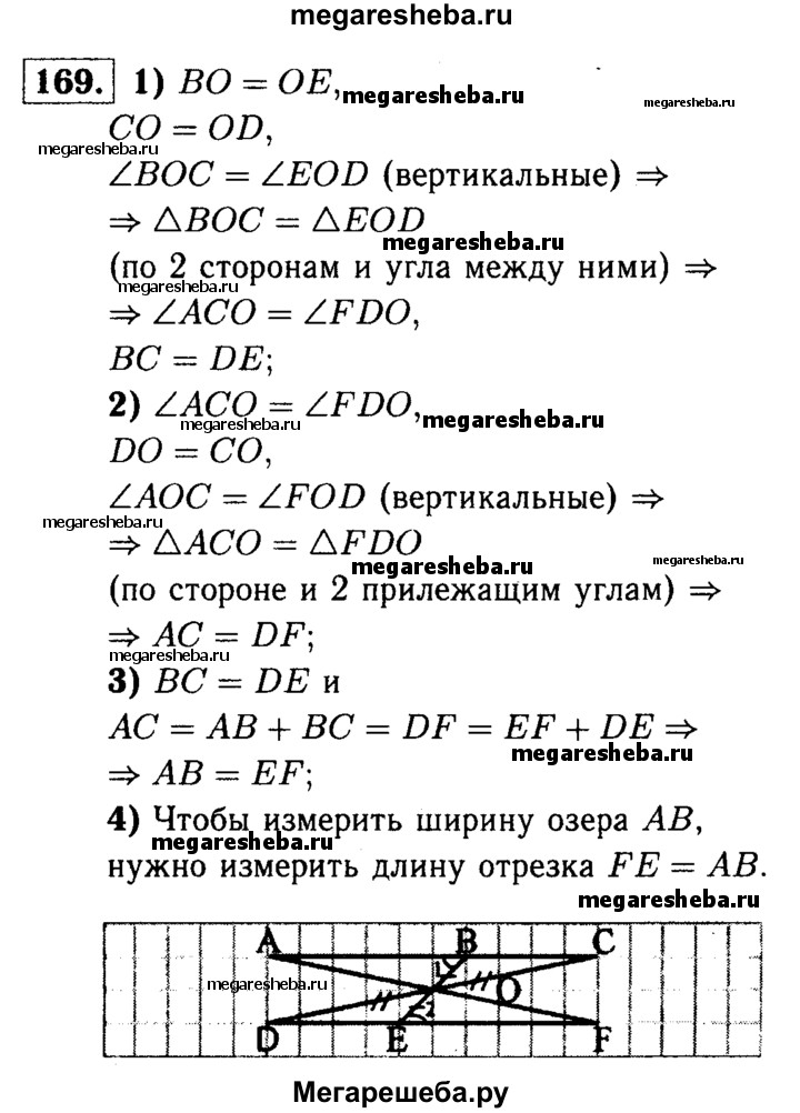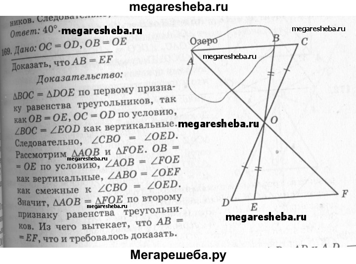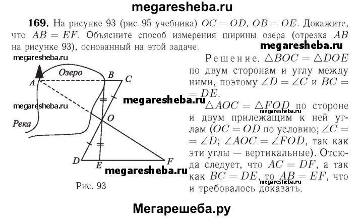 169 На рисунке 95 OC = OD, ОВ = ОЕ. Докажите, что АВ = EF. Объясните способ измерения ширины озера (отрезка АВ на рисунке 95), основанный на этой задаче.