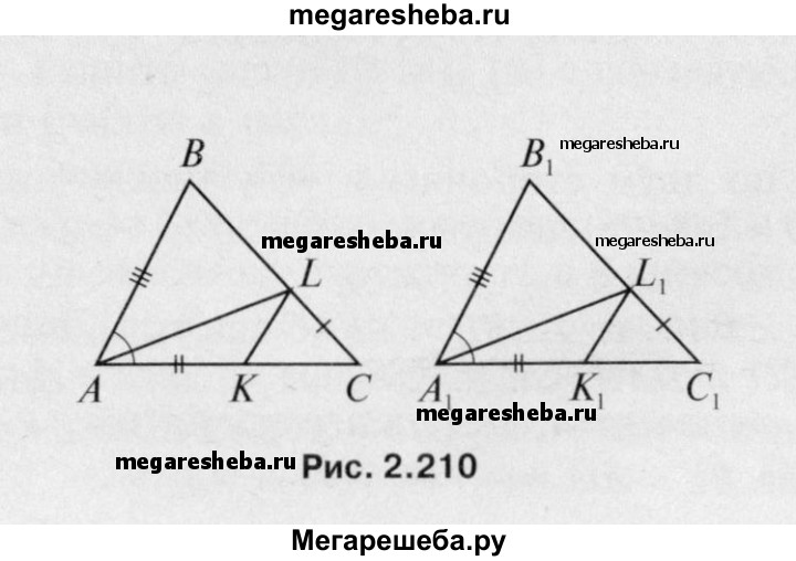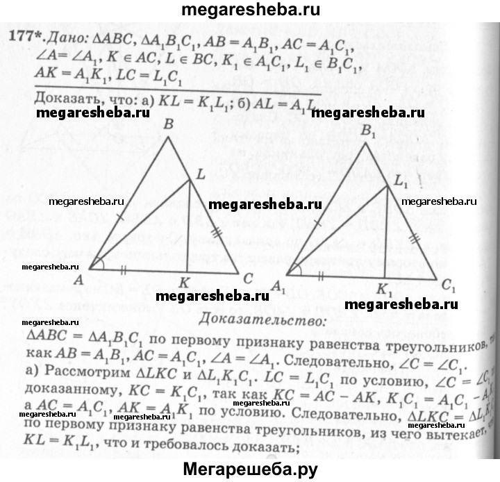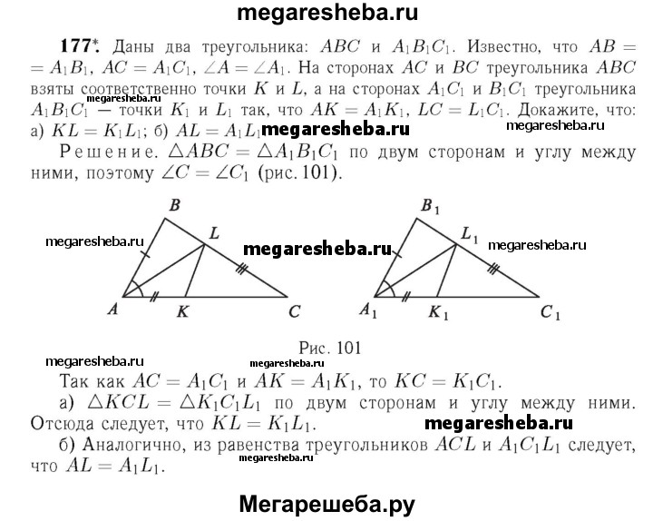 177* Даны два треугольника: ABC и А1В1С1. Известно, что АВ = А1В1, АС = А1С1, ∠A = ∠AX. На сторонах АС и ВС треугольника ABC взяты соответственно точки К и L, а на сторонах А1С1 и В1С1 треугольника А1В1С1 — точки К1 и L1 так, что АК = А1К1, LC = L1C1. Докажите, что: a) KL = K1L1; б) AL = A1L1.