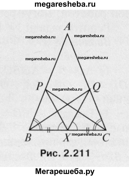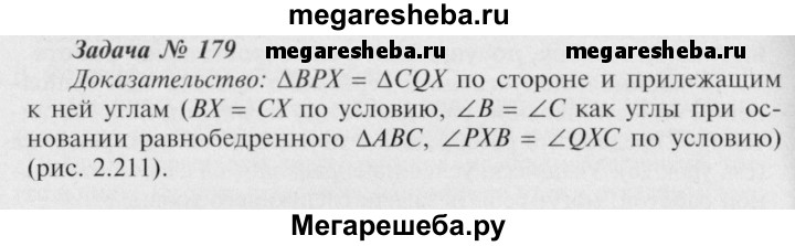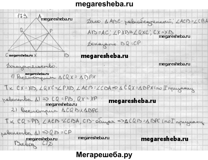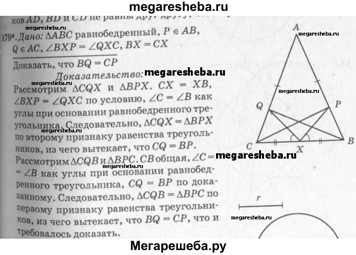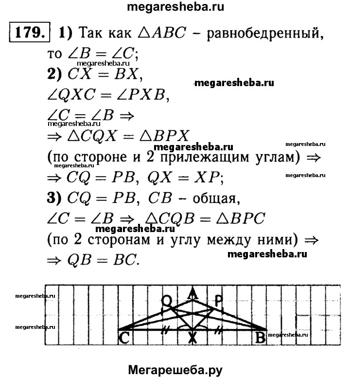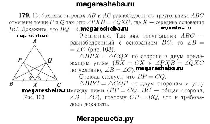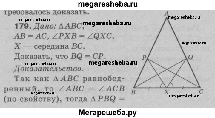 179* На боковых сторонах АВ и АС равнобедренного треугольника ABC отмечены точки Р и Q так, что ∠PXB = ZQXC, где X — середина основания ВС. Докажите, что BQ = СР.