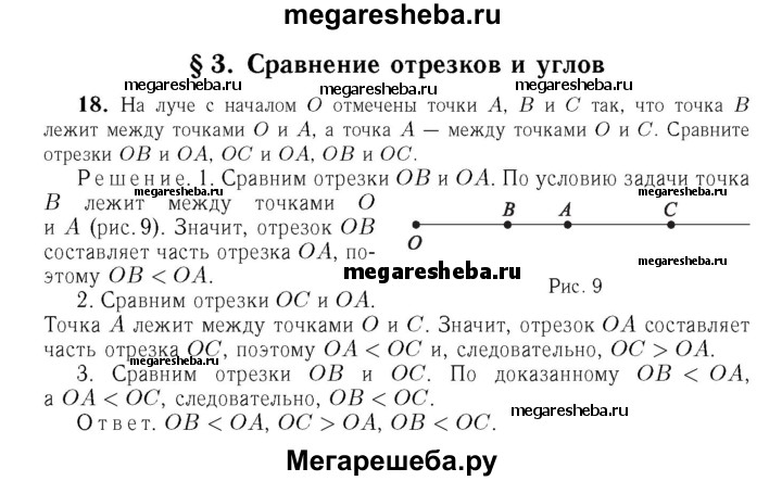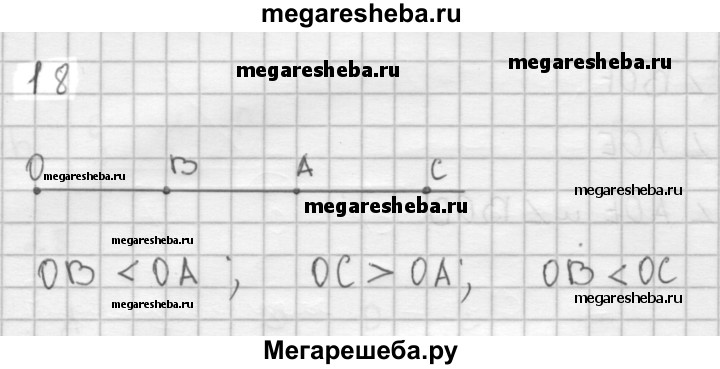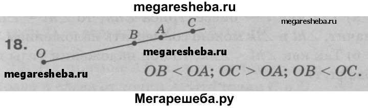 18 На луче с началом О отмечены точки А, В и С так, что точка В лежит между точками О и А, а точка А — между точками О и С. Сравните отрезки ОВ и OA, ОС и OA, OB и ОС.