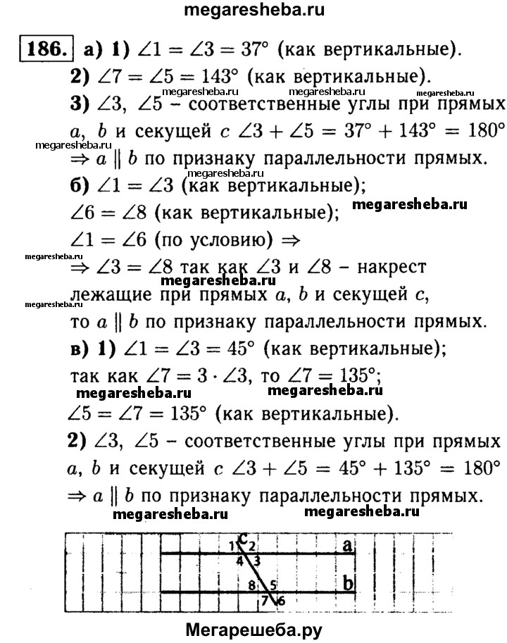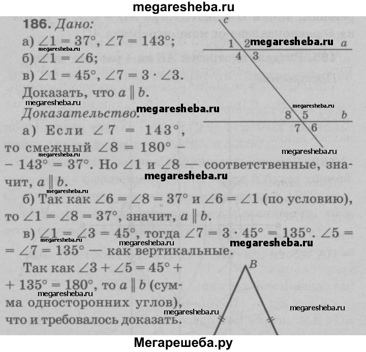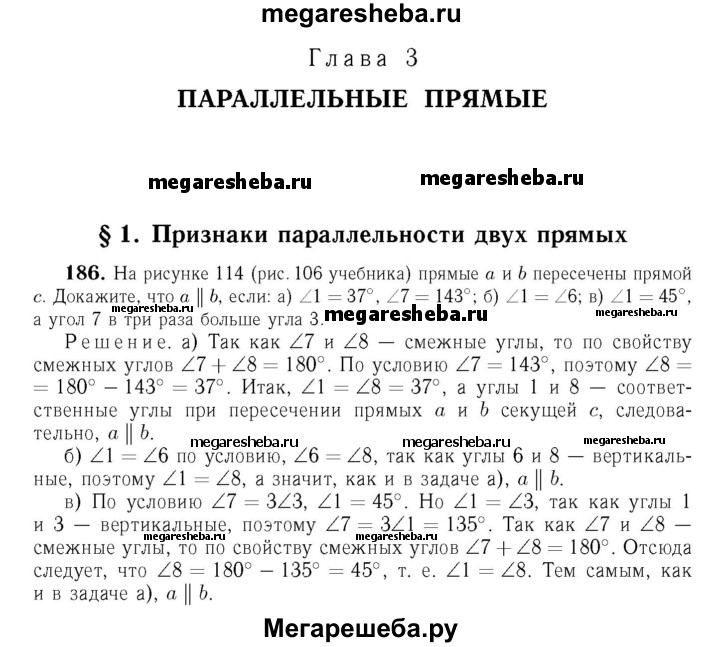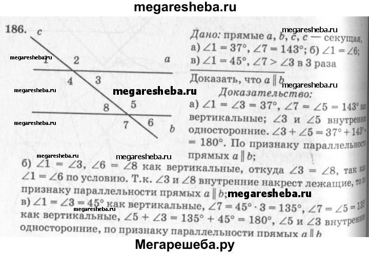 186 На рисунке 106 прямые а и b пересечены прямой с. Докажите, что а || Ь, если: а) ∠1 = 37°, ∠7 = 143°; б) ∠1 = Z6; в) ∠l = 45°, а угол 7 в три раза больше угла 3.