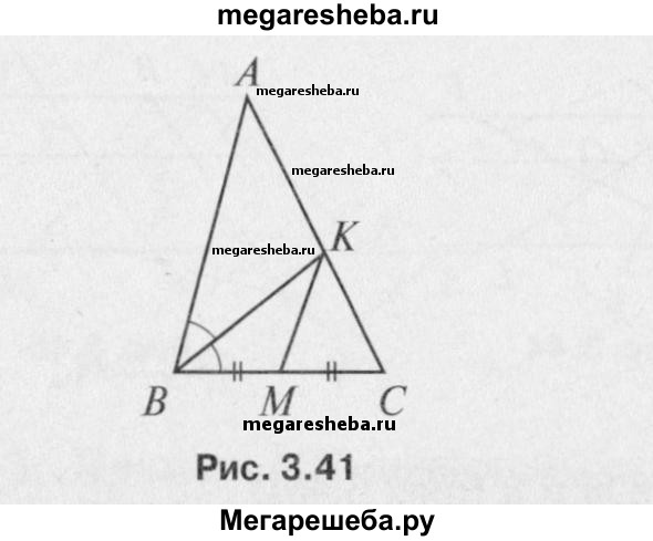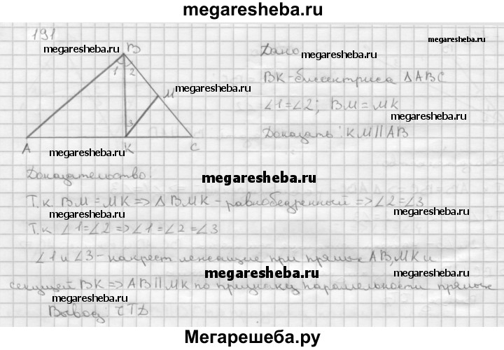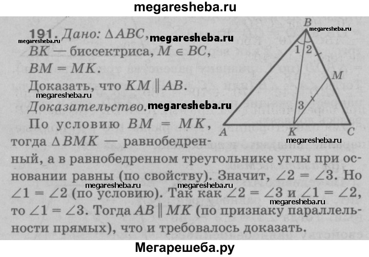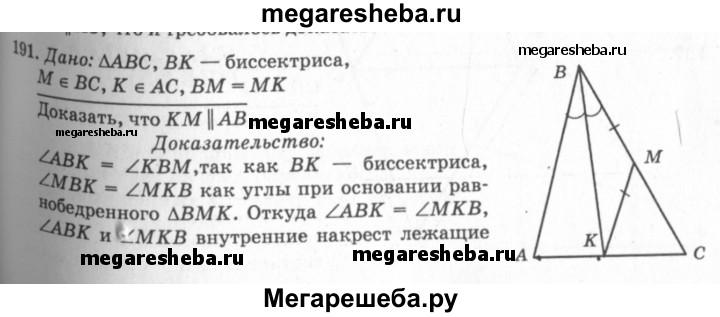 191 Отрезок ВК — биссектриса треугольника ABC. Через точку К проведена прямая, пересекающая сторону ВС в точке М так, что ВМ = МК. Докажите, что прямые КМ и АВ параллельны.