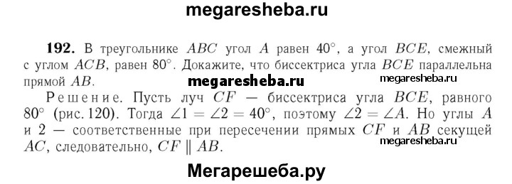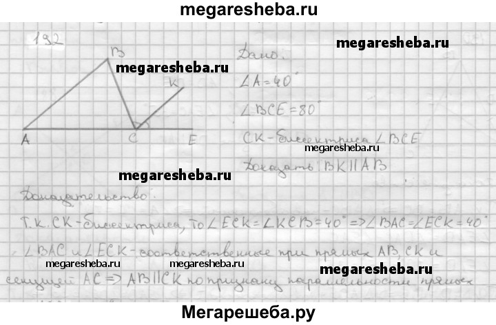 192 В треугольнике ABC угол А равен 40°, а угол ВСЕ, смежный с углом АС В, равен 80°. Докажите, что биссектриса угла ВСЕ параллельна прямой АВ.