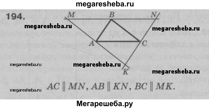 194 Начертите треугольник. Через каждую вершину этого треугольника с помощью чертёжного угольника и линейки проведите прямую, параллельную противоположной стороне.