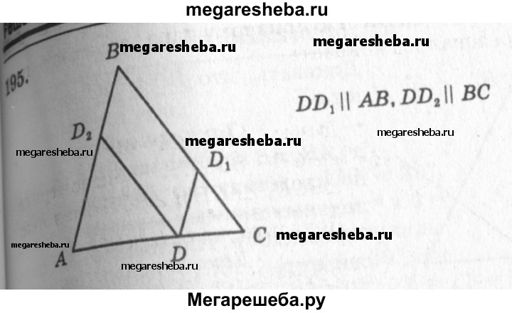 195 Начертите треугольник ABC и отметьте точку D на стороне АС. Через точку D с помощью чертёжного угольника и линейки проведите прямые, параллельные двум другим сторонам треугольника.