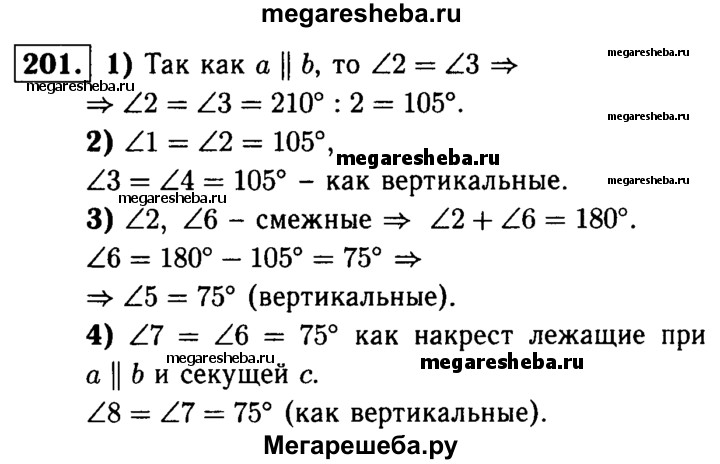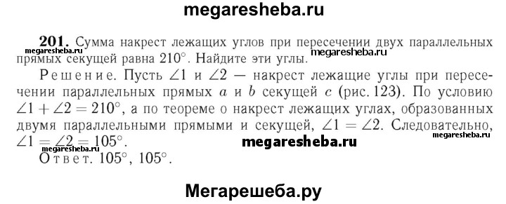 201 Сумма накрест лежащих углов при пересечении двух параллельных прямых секущей равна 210°. Найдите эти углы.