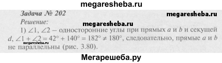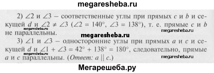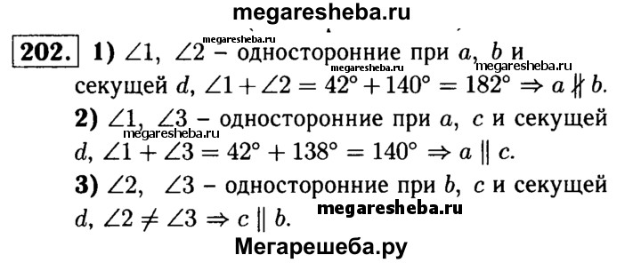 202 На рисунке 118 прямые a, b и с пересечены прямой d, ∠1 = 42°, ∠2 = 140°, ∠3 = 138°. Какие из прямых а, b и с параллельны?
