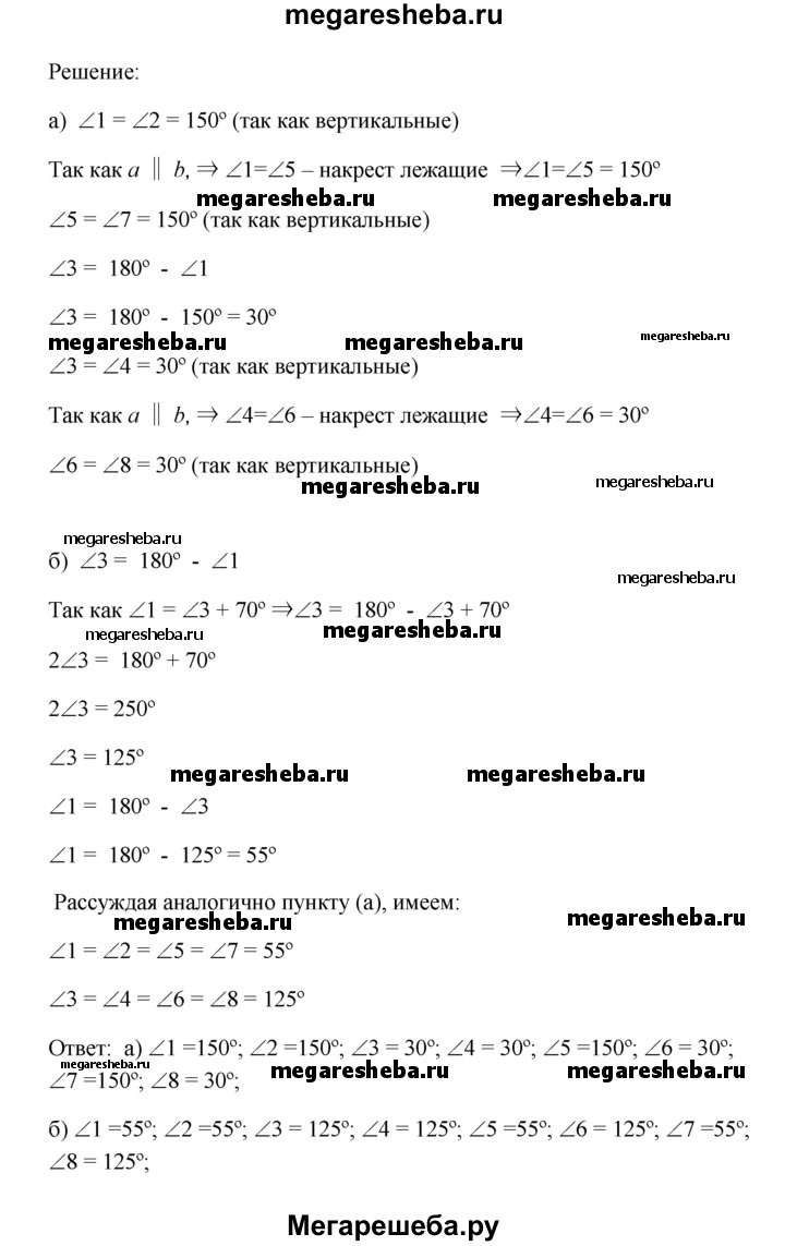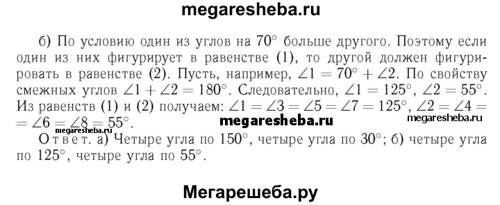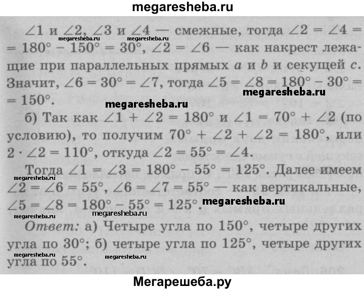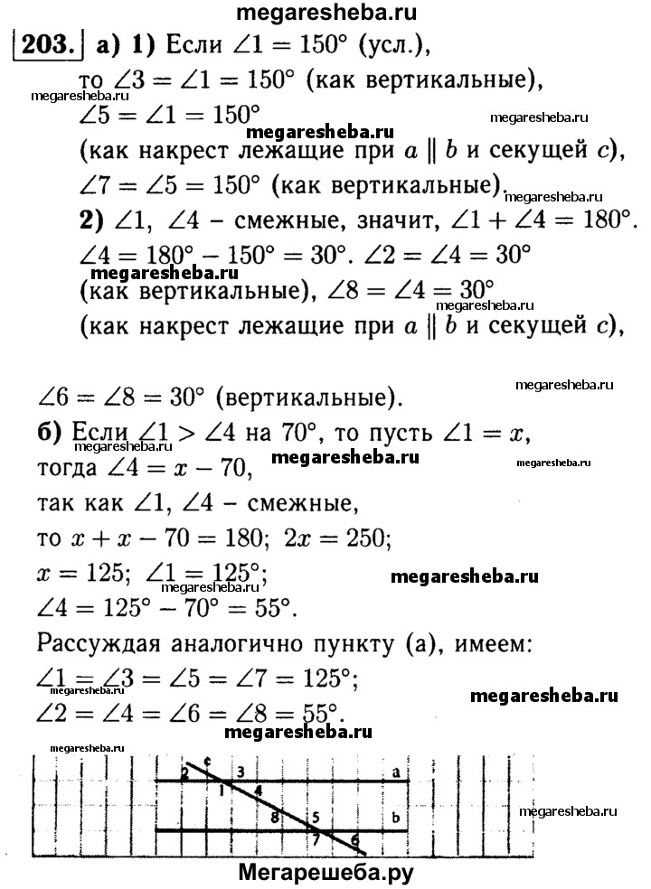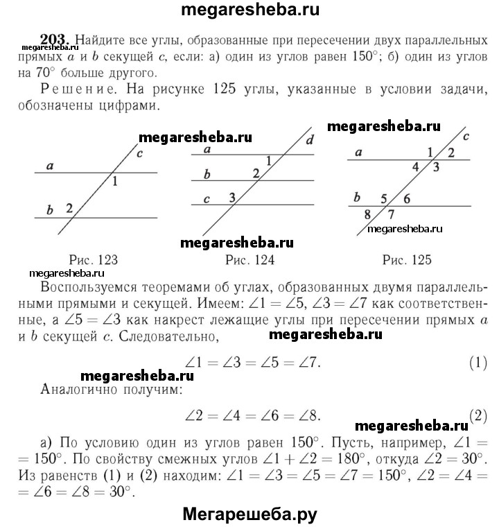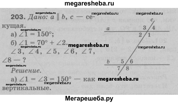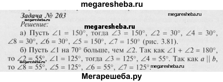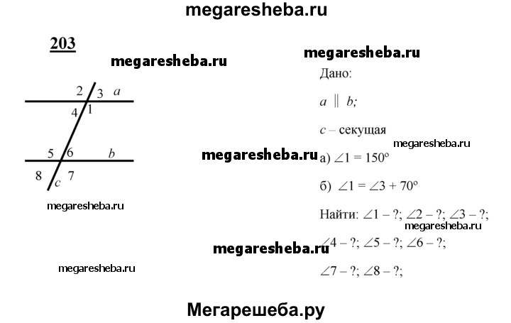 203 Найдите все углы, образованные при пересечении двух параллельных прямых а и b секущей с, если: а) один из углов равен 150°; б) один из углов на 70° больше другого.