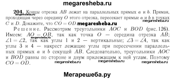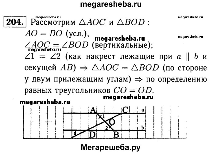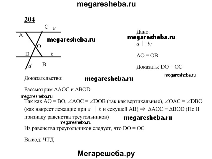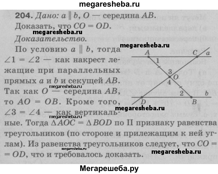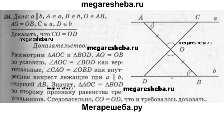 204 Концы отрезка АВ лежат на параллельных прямых а и Ь. Прямая, проходящая через середину О этого отрезка, пересекает прямые а и b в точках С и D. Докажите, что СО - OD