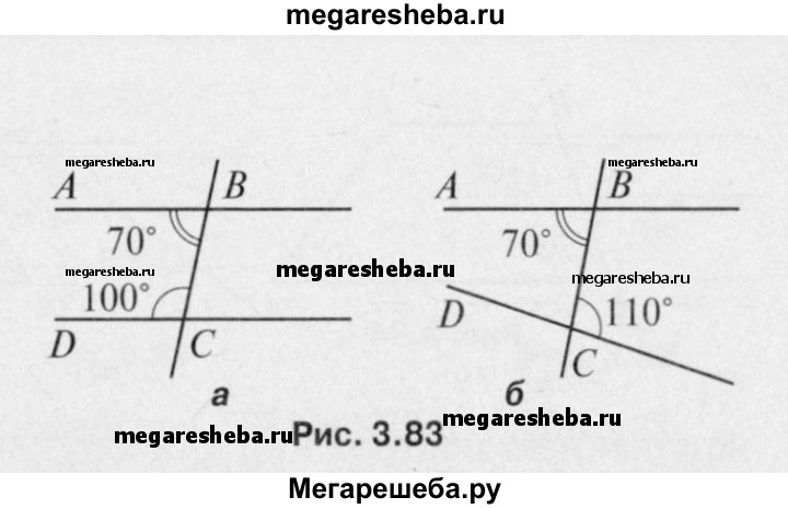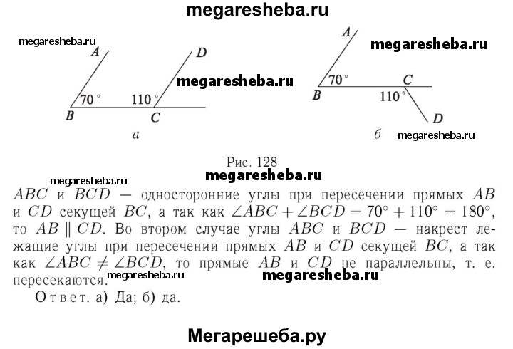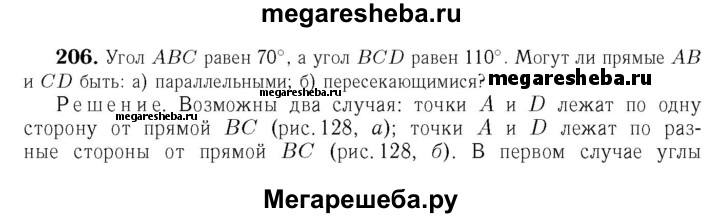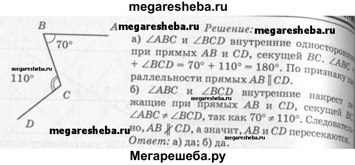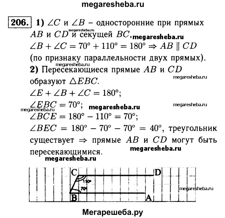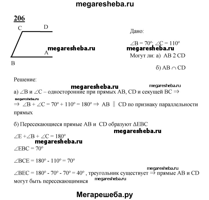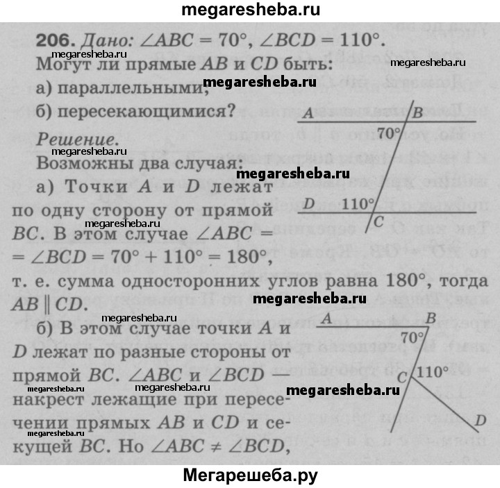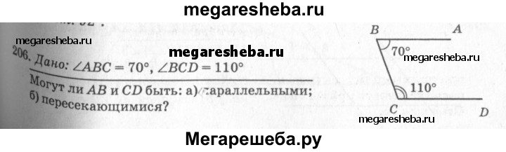 206 ∠ABC= 70°, a ∠BCD = 110°. Могут ли прямые АВ и CD быть: а)параллельными б)пересекающимися?