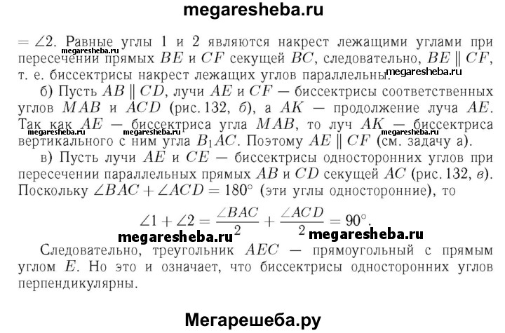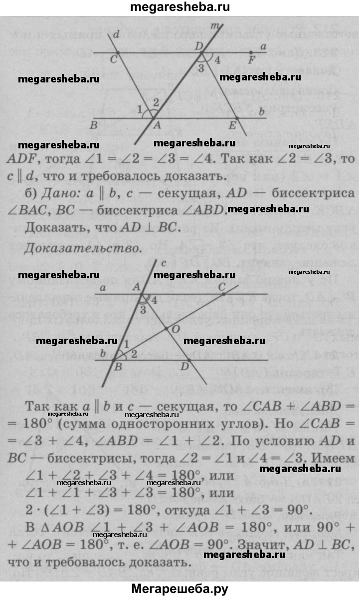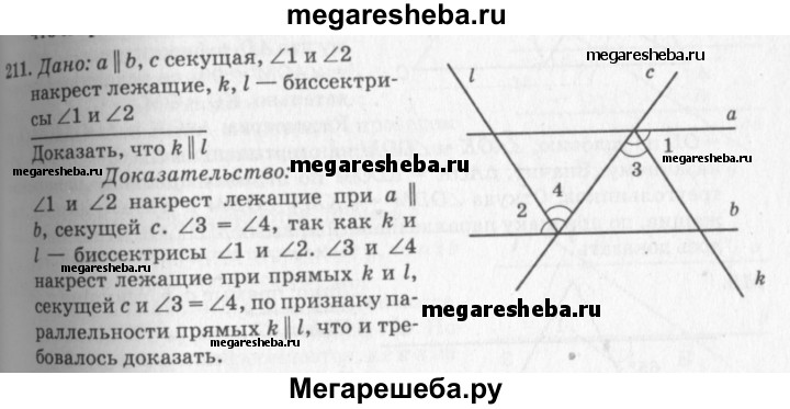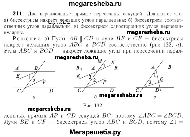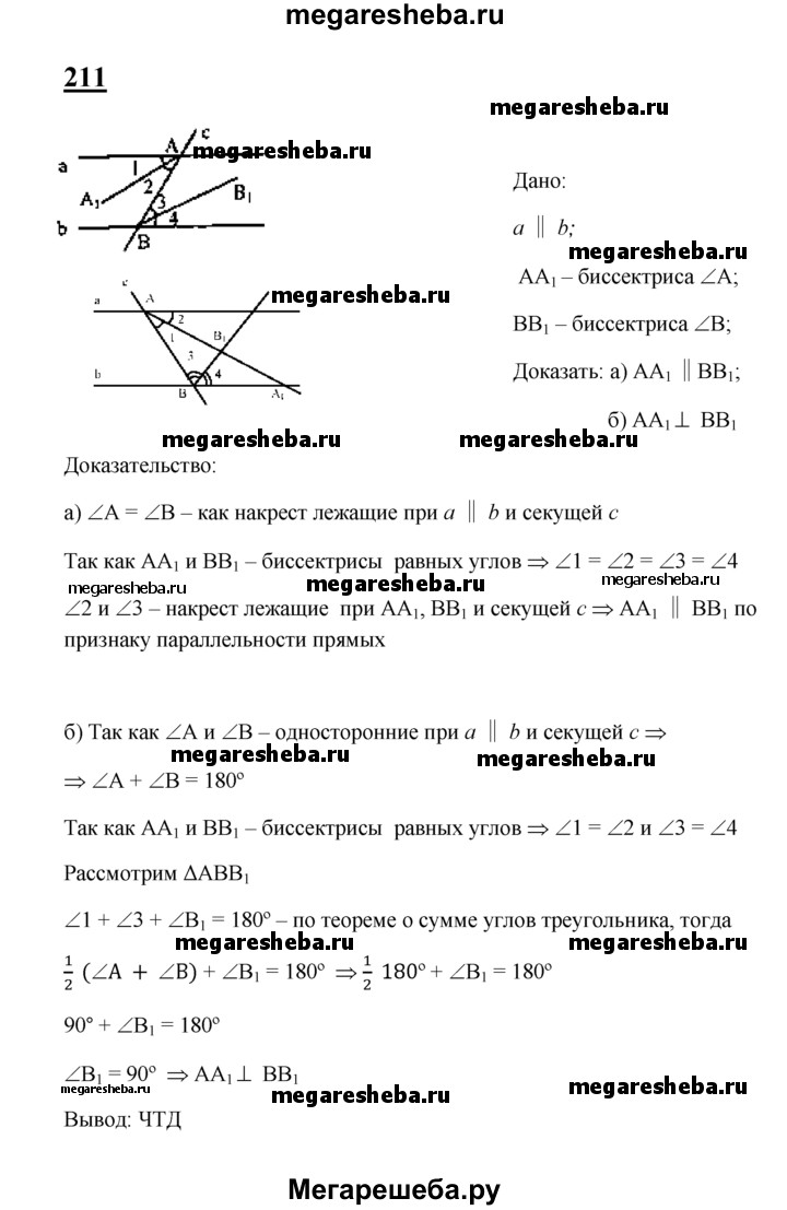 211 Две параллельные прямые пересечены секущей. Докажите, что: а) биссектрисы накрест лежащих углов параллельны; б) биссектрисы односторонних углов перпендикулярны.