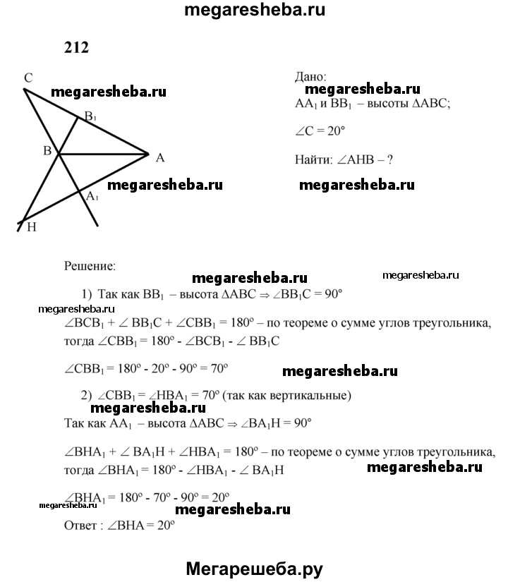 212 Прямые, содержащие высоты АА1 и ВВ1 треугольника ABC, пересекаются в точке Н, угол В — тупой, ∠C = 20°. Найдите угол АHВ.