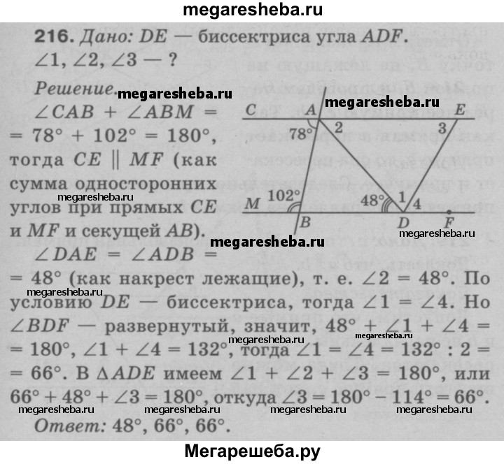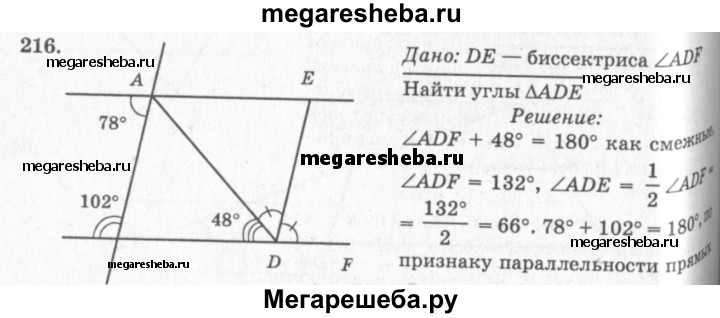 216 На рисунке 124 DE — биссектриса угла ADF. По данным рисунка найдите углы треугольника ADE.