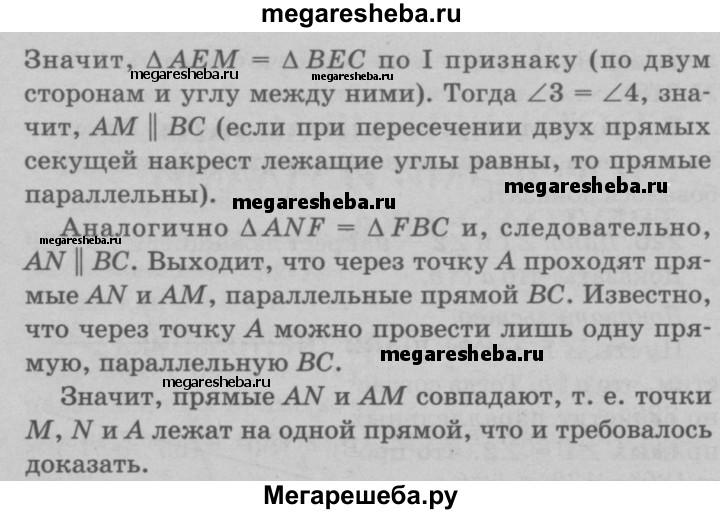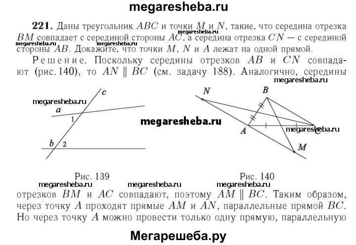 221 Даны треугольник ABC и точки М и N такие, что середина отрезка ВМ совпадает с серединой стороны АС, а середина отрезка CN — с серединой стороны АВ. Докажите, что точки М, N и А лежат на одной прямой.