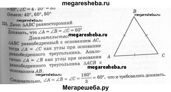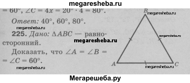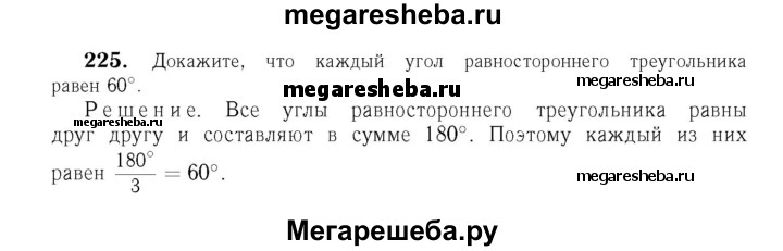 225 Докажите, что каждый угол равностороннего треугольника равен 60°.