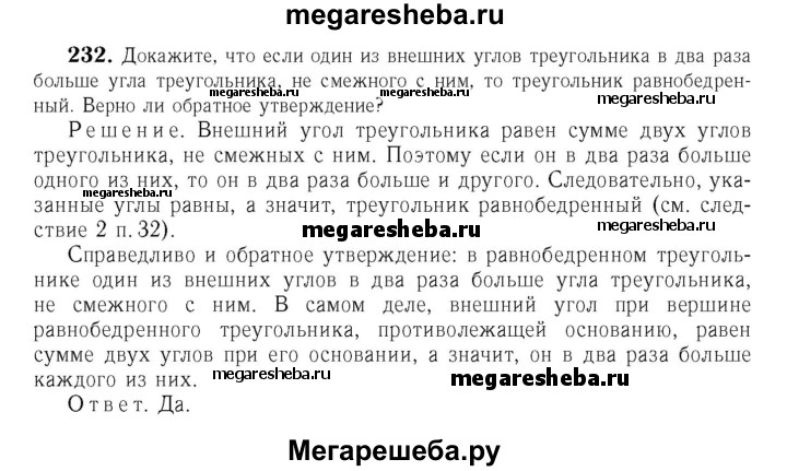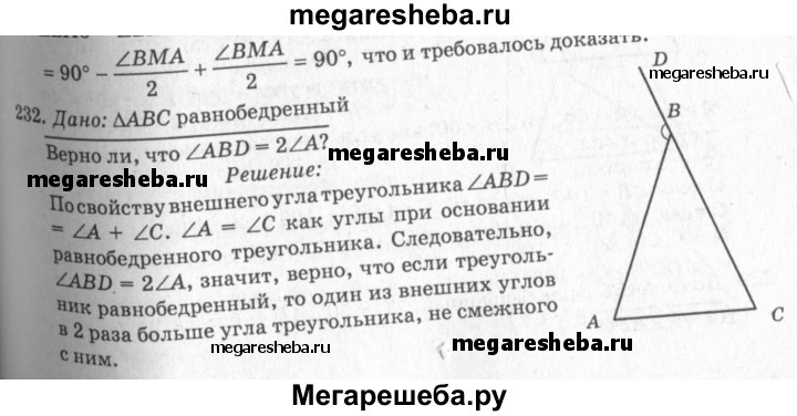 232 Верно ли утверждение: если треугольник равнобедренный, то один из его внешних углов в два раза больше угла треугольника, не смежного с этим внешним углом?