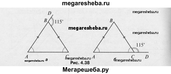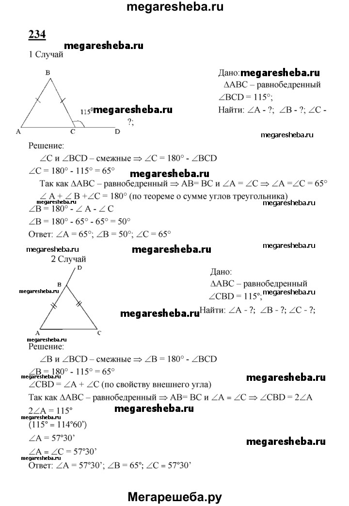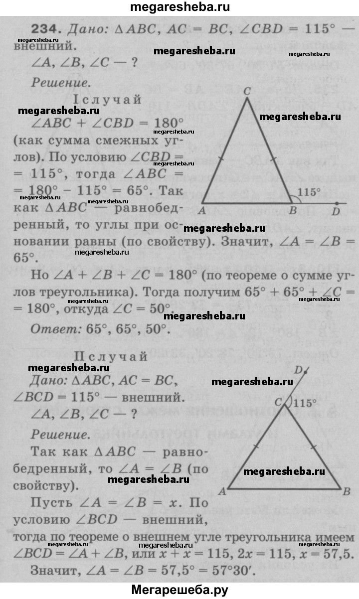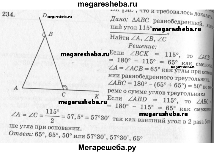 234 Один из внешних углов равнобедренного треугольника равен 115°. Найдите углы треугольника.