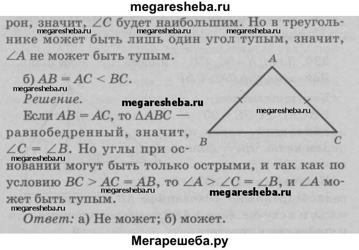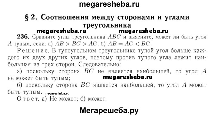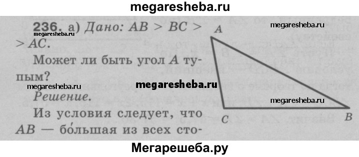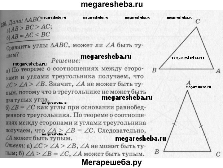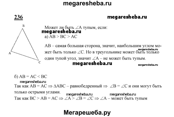 236 Сравните углы треугольника ABC и выясните, может ли быть угол А тупым, если: а) АВ> ВС> АС; б) АВ = АС<ВС.