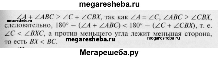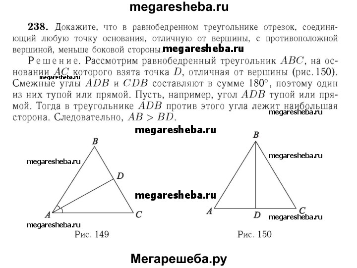 238 Докажите, что в равнобедренном треугольнике отрезок, соединяющий любую точку основания, отличную от вершины, с противоположной вершиной, меньше боковой стороны.