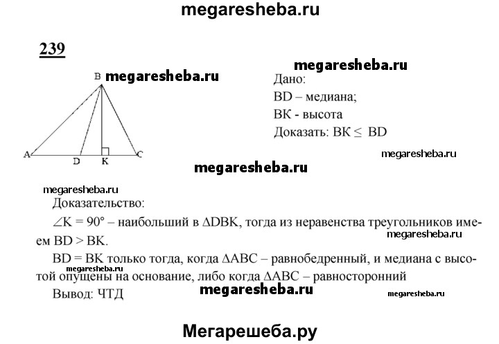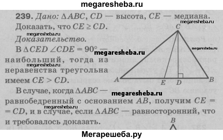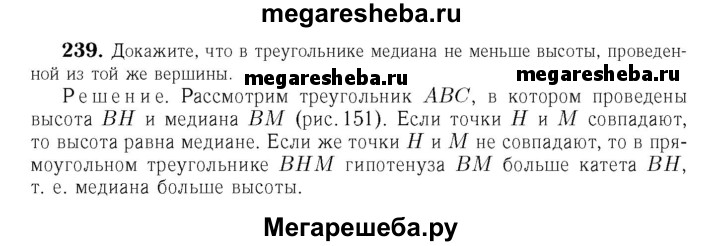 239 Докажите, что в треугольнике медиана не меньше высоты, проведённой из той же вершины.