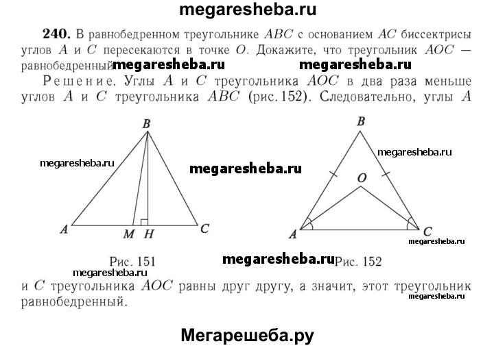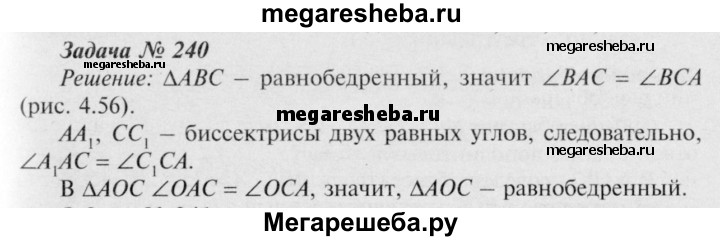 240 В равнобедренном треугольнике ABC с основанием АС биссектрисы углов А и С пересекаются в точке О. Докажите, что треугольник АОС — равнобедренный.
