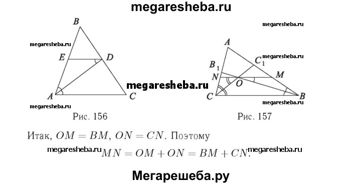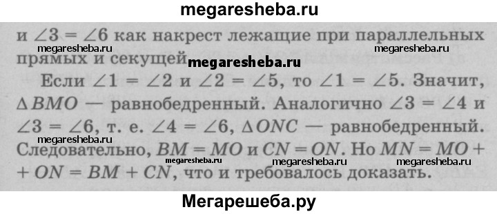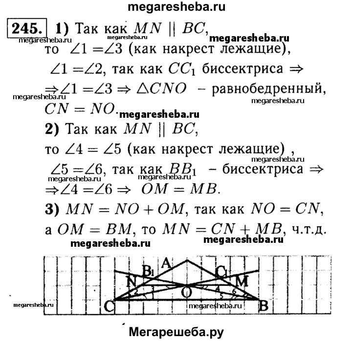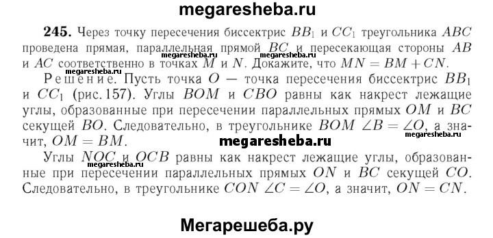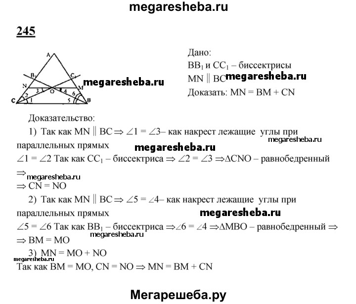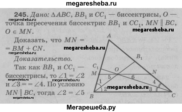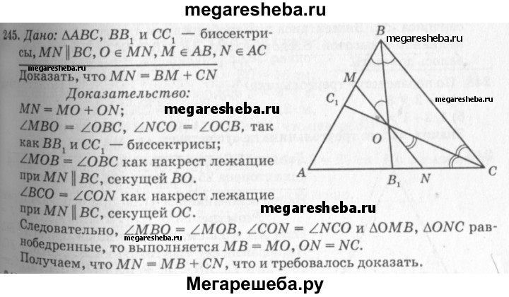 245 Через точку пересечения биссектрис ВВ1 и СС1 треугольника ABC проведена прямая, параллельная прямой ВС и пересекающая стороны АВ и АС соответственно в точках М и N. Докажите, что MN = ВМ + CN.