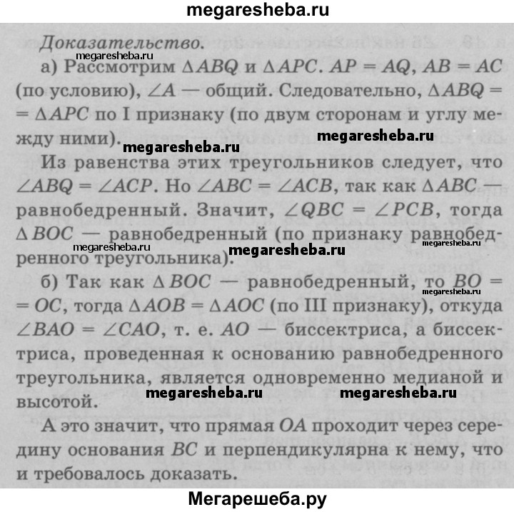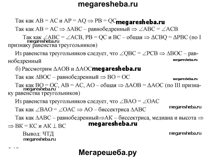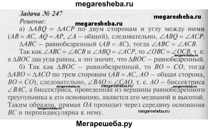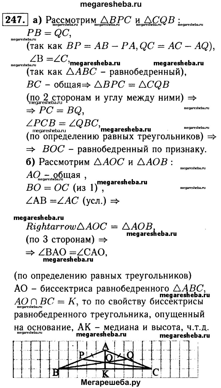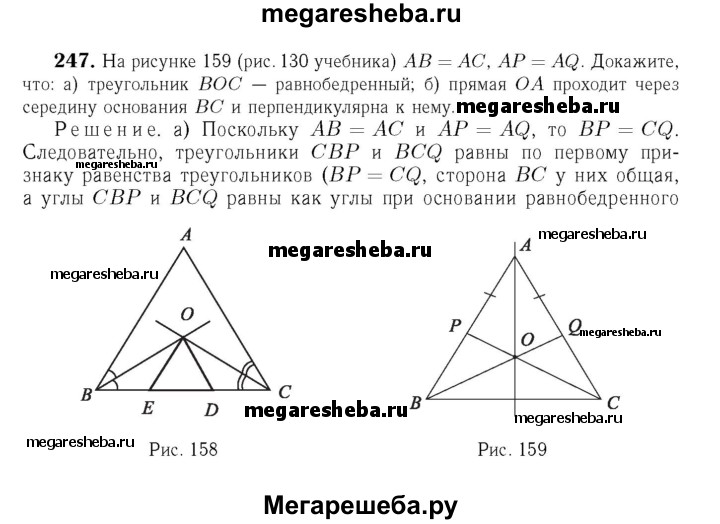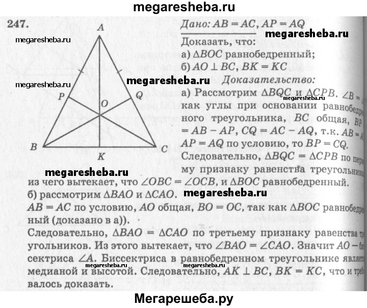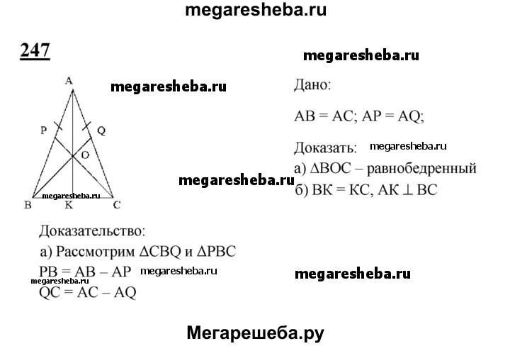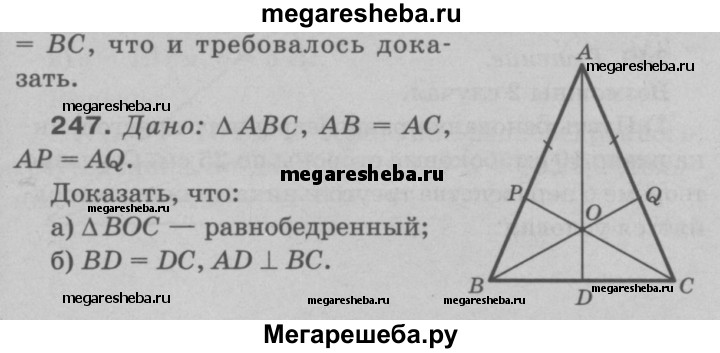 247 На рисунке 130 АВ = АС, AP = AQ. Докажите, что: а) треугольник ВОС — равнобедренный; б) прямая OA проходит через середину основания ВС и перпендикулярна к нему.