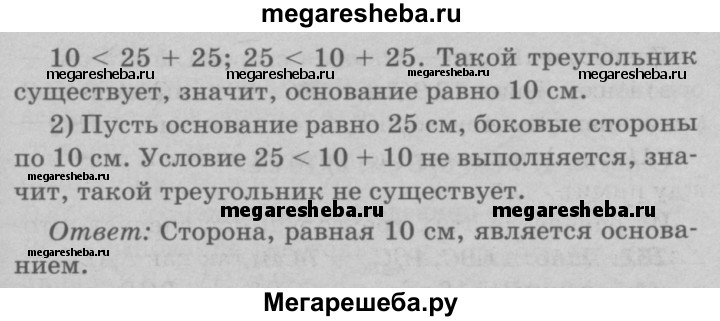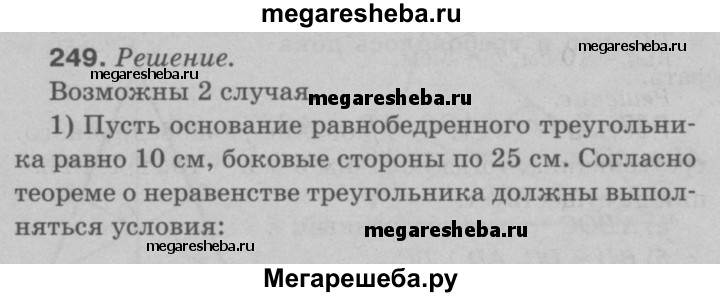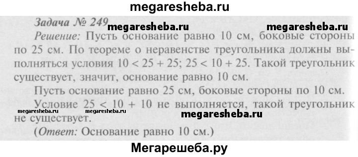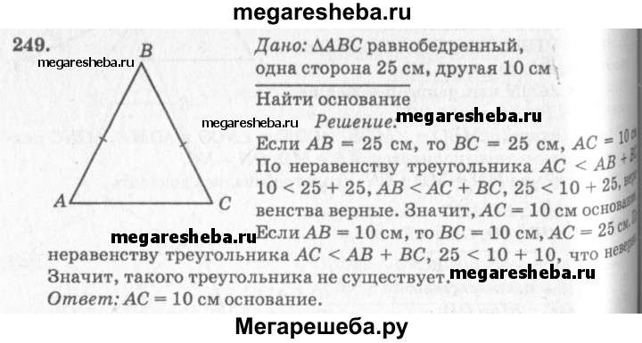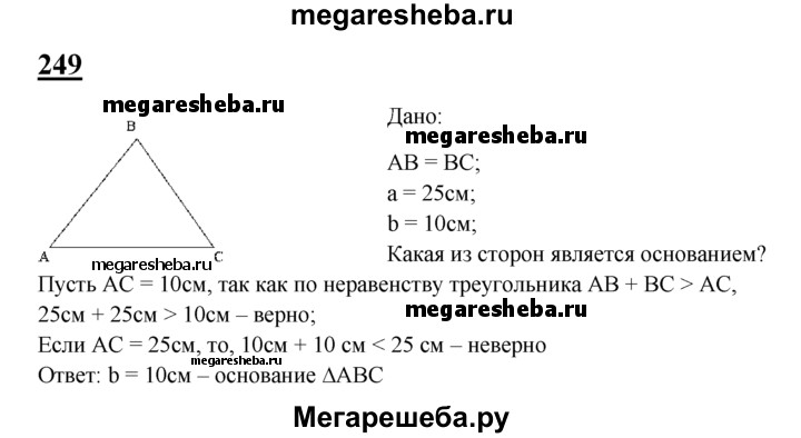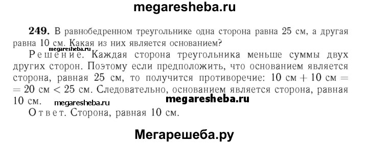 249 В равнобедренном треугольнике одна сторона равна 25 см, а другая равна 10 см. Какая из них является основанием?