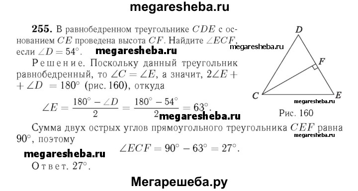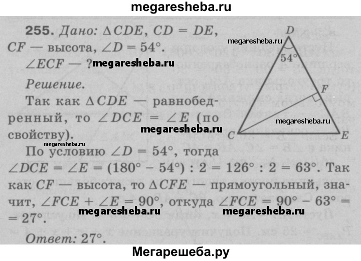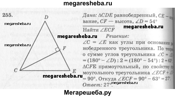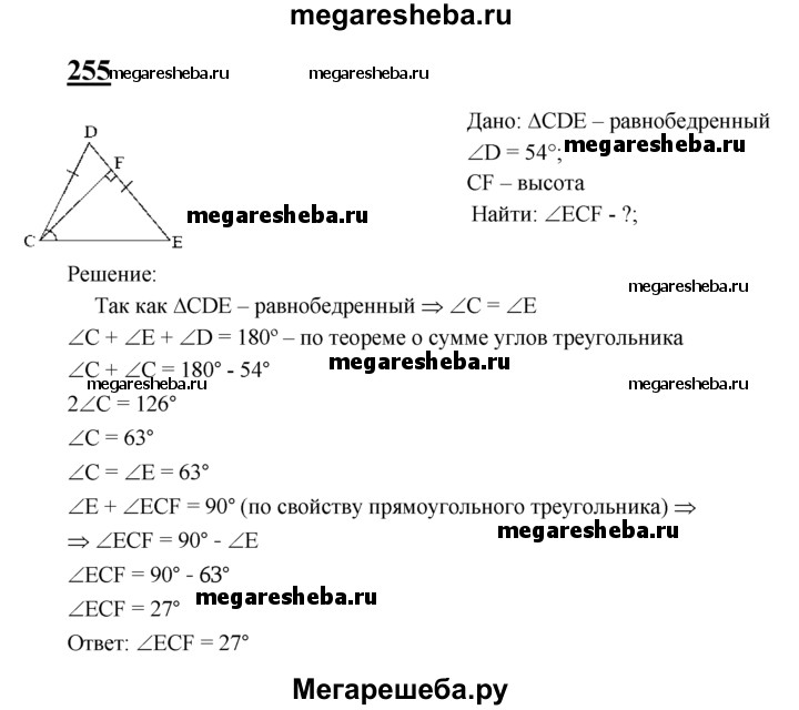 255 В равнобедренном треугольнике CDE с основанием СЕ проведена высота CF. Найдите ZECF, если ZD = 54°.
